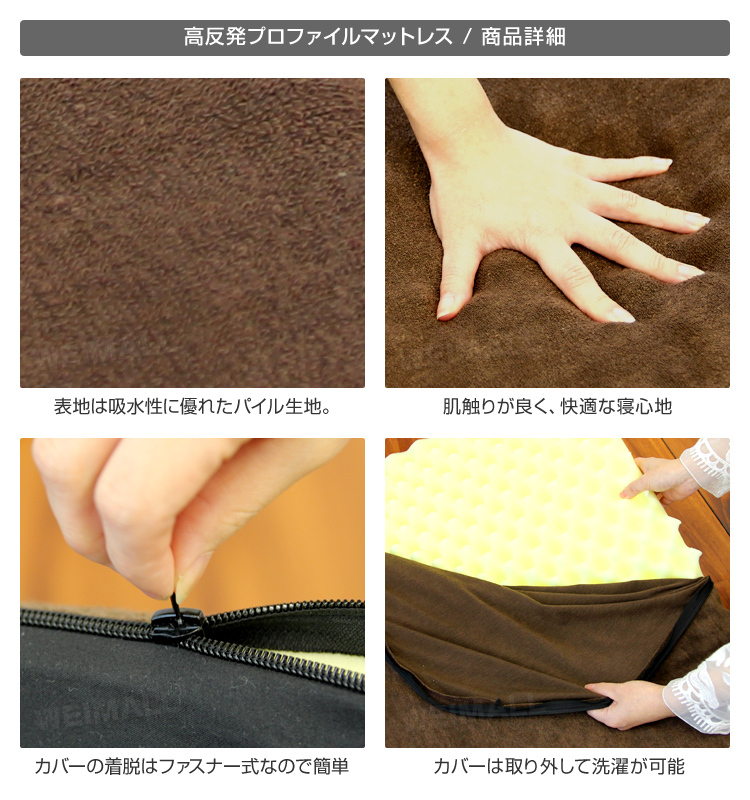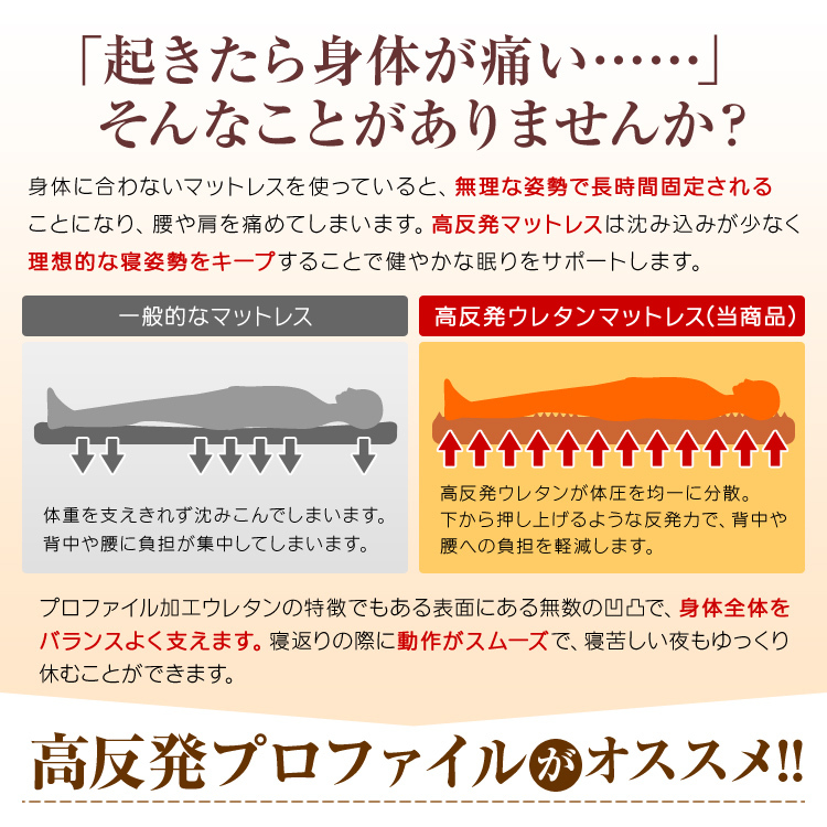 | ちょっとした時のリラックスタイムに! 高反発プロファイル マルチマットレスです。 マルチマットレスは、高反発ウレタンで弾性が高く、適当な硬さで体を支えます。 高反発ウレタンには、プロファイルを採用しているので各凹凸が体を点で支えることで負担が一点に集中しないのが特徴です。 通気性にも優れ、熱がこもりにくく、湿気を逃す効果もあります。 お昼寝時や転がって読書や仮眠したい時など、リラックスタイムにおすすめ。 車中泊やキャンプにも最適です! クルクルと丸めることができ、収納持ち運びにも便利です。 【商品仕様】 内容:本体 ×1 カラー:ブラウン サイズ:(約)60cm×180cm×6cm 重量:(約)1.5kg 素材:高反発ウレタン、ポリエステル100% |