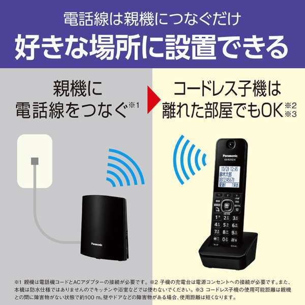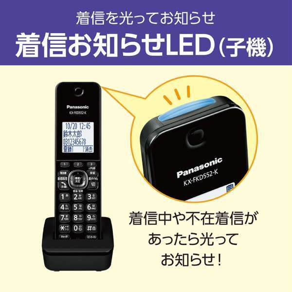 | Panasonic VE-GDL49DL-K デジタルコードレス電話機(子機1台付き) ブラック 新品未使用品です。 外箱に若干傷みがある場合があります。 あんしんの迷惑電話防止機能 着信音が鳴る前に相手にメッセージで警告する「迷惑防止※1」機能に、録音した通話を第三者との通話中に再生して聞いてもらうことができる「迷惑電話相談※2」機能を搭載。怪しい電話を受けたあとに、家族や警察などにすぐに相談できます。 電話線は親機につなぐだけ※3、宅内のお好きな場所に設置できる※4※5。 ボックス型の親機を電話線に接続すれば、コードレス子機を使いたい場所に設置してお使いいただけます※4※5。 子機が光って分かりやすい「着信お知らせLED」 着信中に光ってお知らせするLEDを子機に搭載。不在着信や留守録音があるときには、ゆっくり点滅して着信があったことをお知らせします。 ※1 ナンバー・ディスプレイサービスを利用している場合、付属子機の電話帳に登録されていない相手からかかってきたときのみ迷惑防止の機能が働きます。 ※2 付属子機のみ、迷惑電話相談の機能が使えます。録音の再生中は電話の相手の声は聞こえますが、自分の声は相手に聞こえません。 ※3 親機は電話機コードとACアダプターの接続が必要です。 ※4 子機の充電台は電源コンセントへの接続が必要です。また、本機は防水仕様ではありませんのでキッチンや浴室などでは使わないでください。 ※5 コードレス子機の使用可能距離は親機との間に障害物がない状態で約100m。壁やドアなどの障害物がある場合、使用距離は短くなります。 ★商品の仕様等に関しては、商品名に基づきご自身でご確認のうえご入札をお願いいたします。 詳しくはこちらご覧下さい。 ※万が一、初期不良や不具合がある場合はメーカーに直接お問い合わせ下さい。 万が一、破損がある場合は運送会社と当方にご連絡下さい。 いかなる場合も返品には承れません。 | |