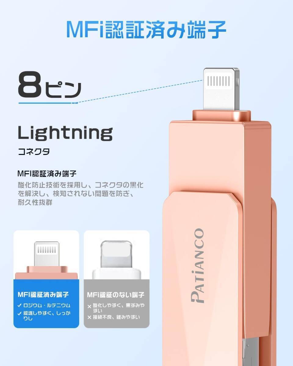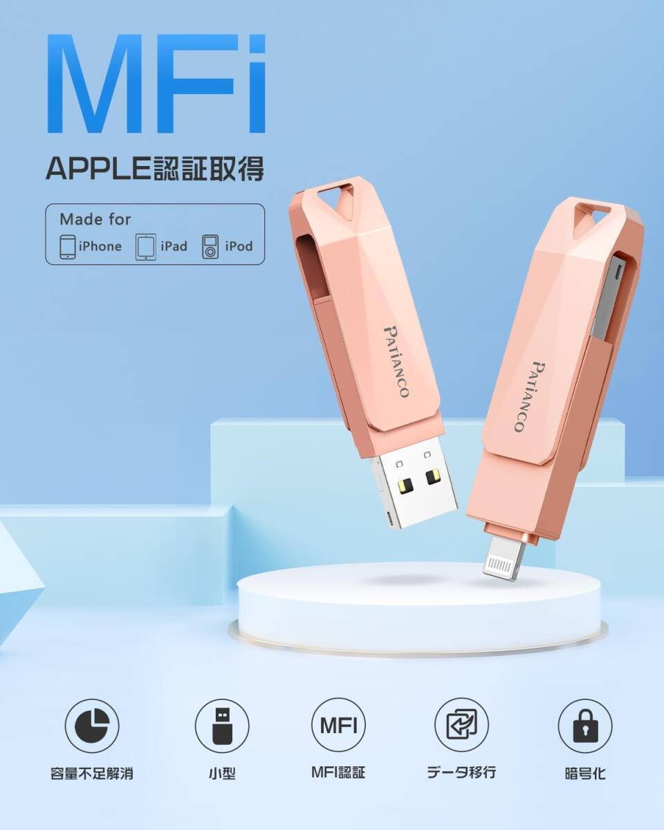 この商品について【MFi認証取得】弊社のUSBメモリーはMFi認証品であり、iPhone/iPad/iPod/との互換性を保証することを示すものです。MFi認証のある製品はApple社に認定されていると同義であり、互換性も保障されていて、安全に利用できることを証明しています。ご購入の際は、MFi認証のあるiPhone用USBメモリをご確認ください。【多機能搭載・iCloud課金対策】本製品はLightning、Type-C、USBコネクタを搭載し、持続的なテストとアップグレードにより、単一端子から複数の端子へのブレークスルーを実現しました。こちらのUSBメモリは、スマホ容量不足解消、データ管理に加え、友人とのデータ共有、ファイルの移動、データ暗号化、連絡先バックアップなどの機能も備えております。パソコンを起動せず、USBケーブルも使用せず、スマホやiPadにUSBメモリを軽く挿入するだけで写真データをUSBメモリに移行し保存できます。iCloudは、無料で利用する場合には5GBの上限があり、iCloud+で容量を増やすには有料です。今は、iCloud の料金を払い続けずに、スマホの容量を減らすことができるようになりました。【高い互換性】弊社のUSBメモリはすべてのiOS機種に対応し、タイプCアダプターも付属しておるので、Type-CコネクタのiPhone、iPad、Type-C機種とも互換性があります。対応機種:iPhone 15 Pro Max/15 Pro/15 Plus/15/iPhone 14 Pro Max/14 Pro/14 Plus/14/SE 3/13 Pro Max/13 Pro /13/13 mini /12 Pro Max/12 Pro/12 /SE 2 /11 Pro Max/11 Pro/11 /XR/XS Max/XS /X /8 Plus/8/7 Plus/7/SE 1/6s Plus /6s/6 Plus/6/ iPad Pro(第1/2/3/4/5/6世代)/ iPad Air(第1/2/3/4/5世代)/ MacBook(Pro/Air)/ iPad mini(第1/2/3/4/5世代)/ iPad(第5/6/7/8/9/10世代)/ PC /ノートパソコン/ Type-C機種などと互換性があります。【高速データ移行・セキュリティ機能付】USB 3.0技術を採用し、写真、動画などのデータを短時間でバックアップできて、USB 2.0と比べて、データ転送時間を大幅に削減します。写真や動画の保存のほか、ファイルや連絡先、スキャンデータ、音楽データ、書籍資料なども保存できて、対応データ形式はさまざまです。専用アプリ内でパスワードを設定しデータを暗号化できるので、データ漏洩を効果的に防止できます。(セキュリティ機能はiOS機種にのみ適用されますので、予めご了承ください。)本製品には日本語図解取扱説明書も付属され、機械が苦手な方でも簡単にデータ移行できます。【多シーン適用・耐久性抜群】こちらのUSBメモリは、コンパクトで持ち運びやすいので、仕事や生活、出先、旅先などにも便利で、飛行機でもUSBメモリを使って保存された動画を見ることができます。小さくデザインもシンプルで360度回転して差し込み口が変えられるので、無駄なスペースを使わず便利です。高い鋳造性や良好な機械的性質をもっておる亜鉛合金を採用し、高級感たっぷりで、磨耗や色落ちがしにくく、耐久性にも優れます。