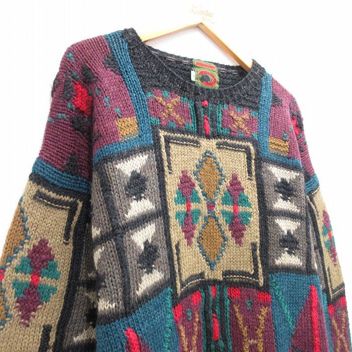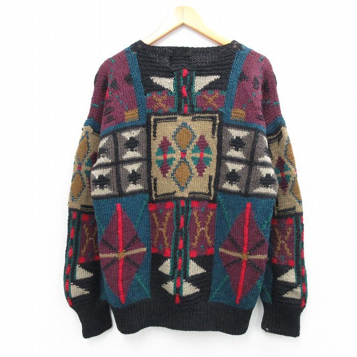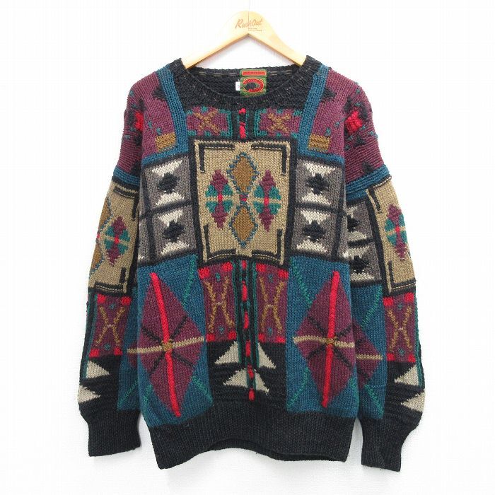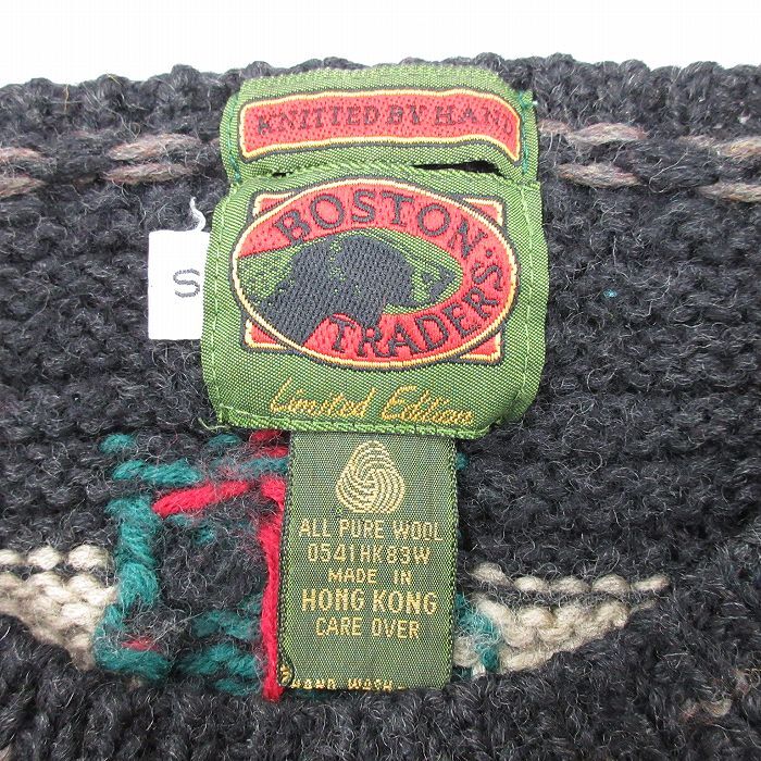【商品名】 L★古着 ボストントレーダース 長袖 セーター メンズ 00年代 00s ハンドニット 手編み ウール クルーネック 黒他【spe】