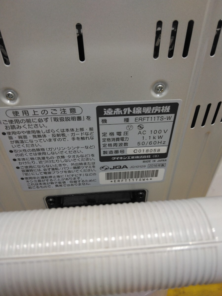・ 【DAIKIN】ダイキン 遠赤外線暖房機 ERFT11TS-W 2016年製 動作確認済 セラムヒート 電気ヒーター 暖房器具 日本製 ホワイト 横向き可能