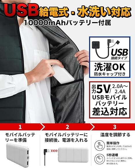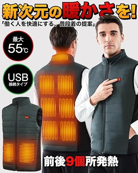 この電熱ベストを手にすれば、寒い朝の通勤も、冷え込むオフィスや屋外作業でも、もう厚着に悩むことはありません。スイッチを入れるだけで、まるで暖房を身にまとったような心地よさを感じられます。