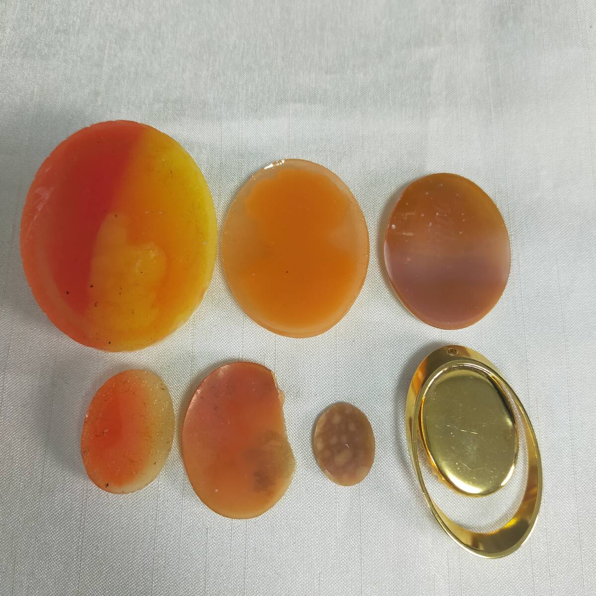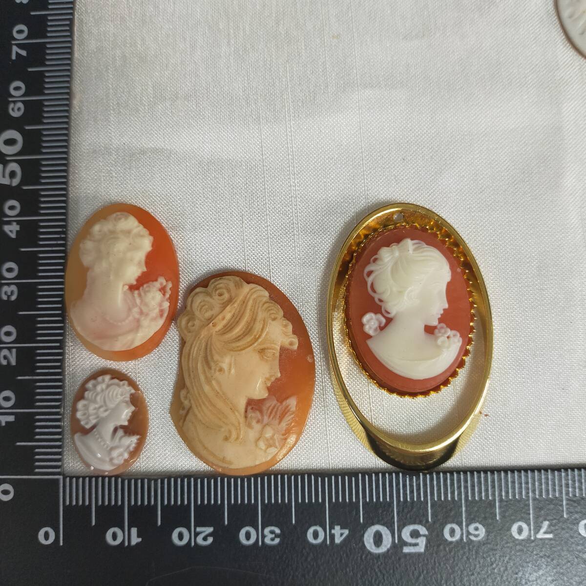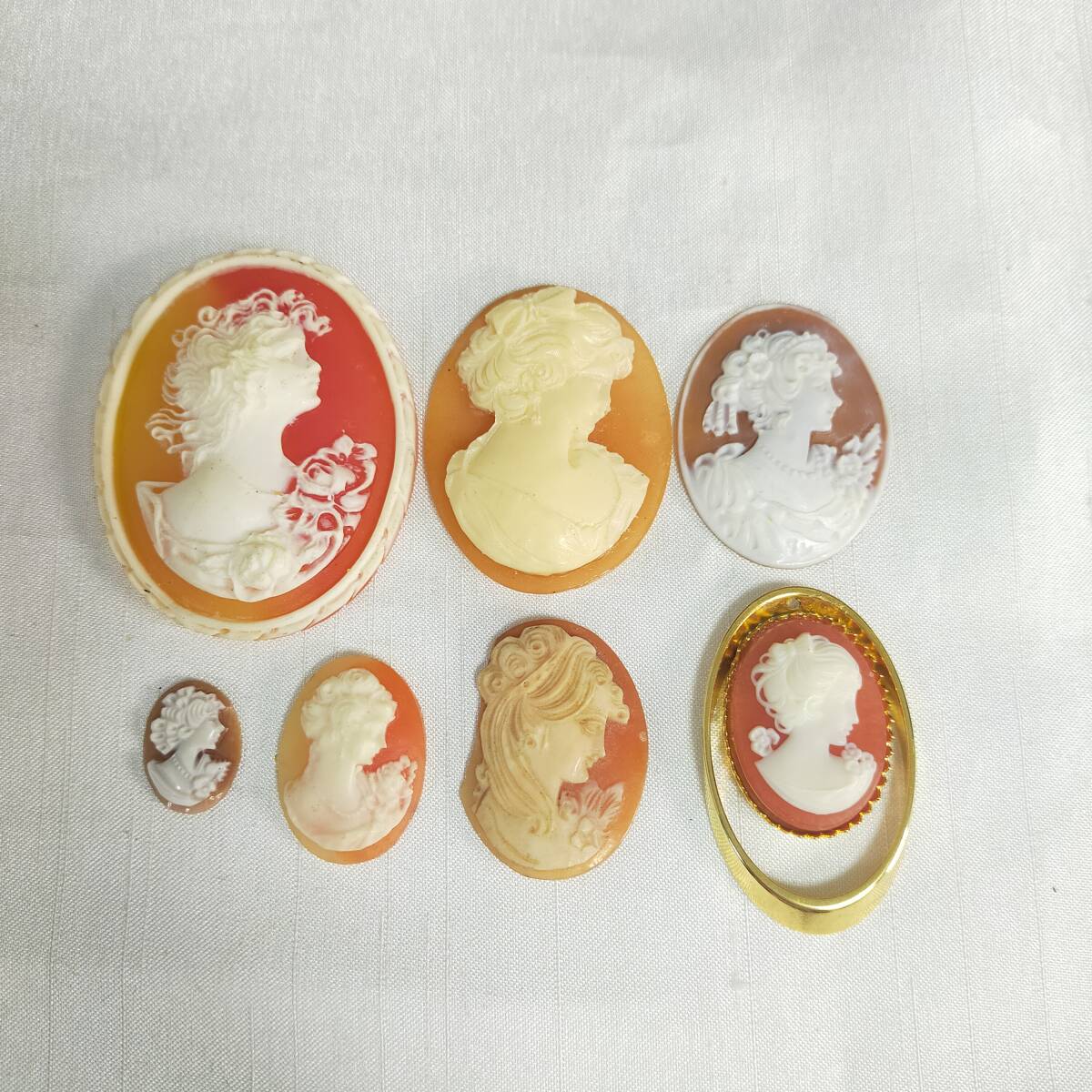 カメオ ペンダントトップ 金具なし ベージュ系 オレンジ系 7つ 総重量約28g レディースアクセサリー 【サイズ】 写真にてご確認ください。 ※素人採寸のため多少の誤差はお許しください。 【商品状態】 破損のものがございます。 素人保管の中古品の為、擦れ・キズ・汚れなどがございます。 その他、商品状態につきましては、掲載写真をよくご確認ください。 写真に写っているものが全てです。 ※商品を飾っている台と計測器は撮影用になりますので付属しません。 目視にて検品チェックをしておりますが見落としがあるかもしれません。 商品状態は出品時の状態です。 実際に使用された際の経年による劣化や故障の保証は出来ません。 ご理解の上、ご了承頂ける方のみのご入札をお願い致します。 中古品につきお届け後の返品・交換などの補償は出来かねます。 | ||||