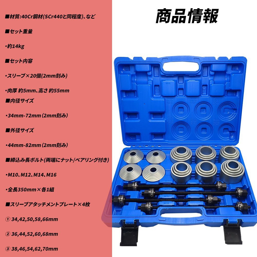 | 商品説明 | ■本セットであればプレス設備が無くても対象物から ブッシュ等の脱着交換が出来て非常に便利! コマ高55mmとコンパクトで作業し易い製品です。 洗練されたキット、優れた性能、高い作業効率、そしてより多くの利便性をもたらします! ■スリーブは高強度なクロム鋼鋼材で出来てますので 油圧プレスでの治具としてもお使い頂けます。 ■専用ケース付きなので保管と整理が簡単!ツールキットには、 ブッシングを取り外すための収納ボックスが付属しており、 持ち運びに便利なので、すべてが整頓されます。 ■参考用途 ●サイレントベアリング ●油圧ベアリング ●ハブベアリング ●ベアリングブッシュ ●ボールベアリング ●シャフトシール ●ゴムベアリング ●エンジンマウントブッシュ ●デフマウントブッシュ ●ロアアーム、他アーム類ブッシュ ■商品情報 ■材質:40Cr鋼材(SCr440と同程度)、など ■セット重量 ・約14kg ■セット内容 ・スリーブ×20個(2mm刻み) ・肉厚 約5mm、高さ 約55mm ■内径サイズ ・34mm-72mm(2mm刻み) ■外径サイズ ・44mm-82mm(2mm刻み) ■締込み長ボルト(両端にナット/ベアリング付き) ・M10、M12、M14、M16 ・全長350mm×各1組 ■スリーブアタッチメントプレート×4枚 ① 34,42,50,58,66mm ② 36,44,52,60,68mm ③ 38,46,54,62,70mm ④ 40,48,56,64,72mm ※入荷のタイミング・ロットにより予告なくケースの色や仕様が変更する場合がございます。予めご了承くださいませ。