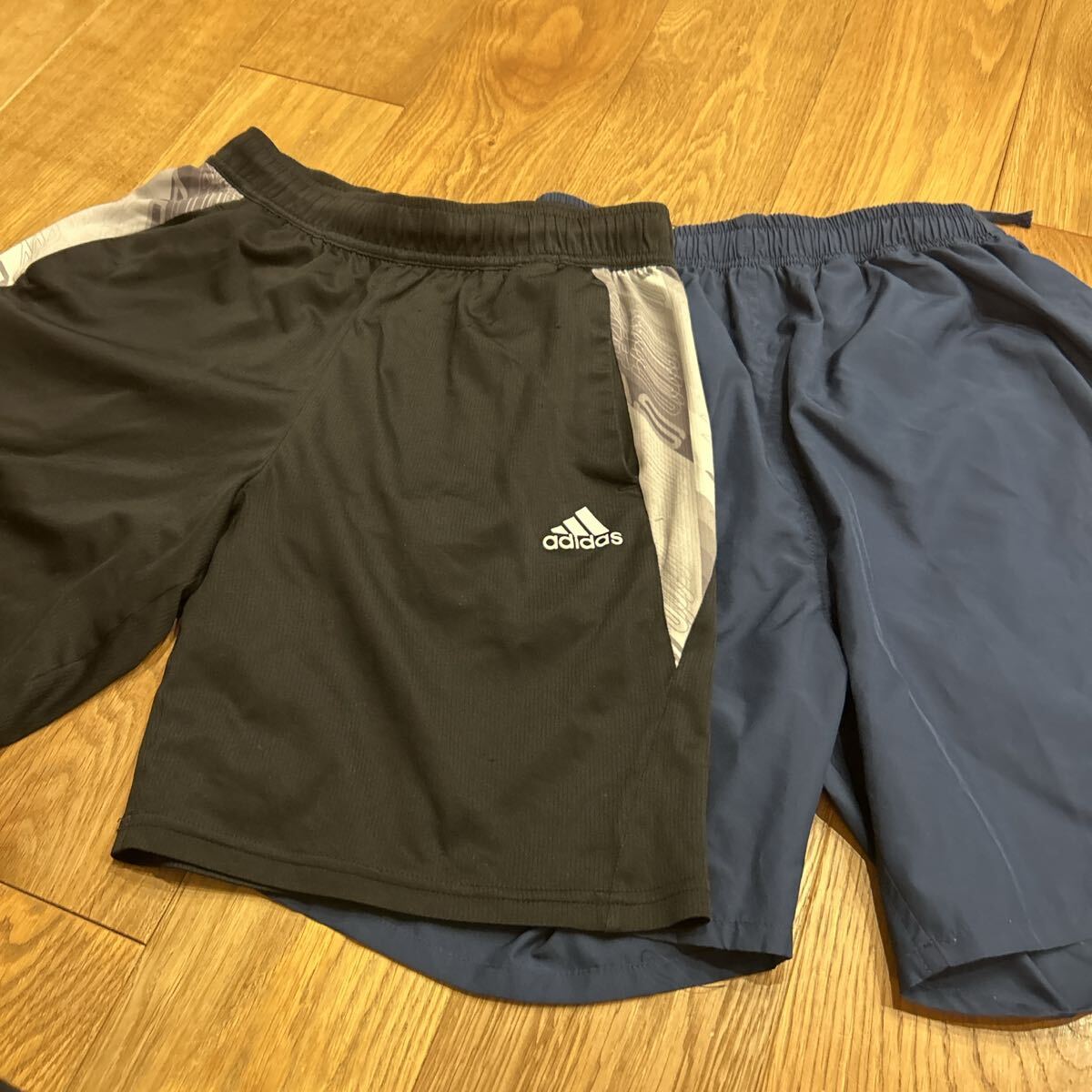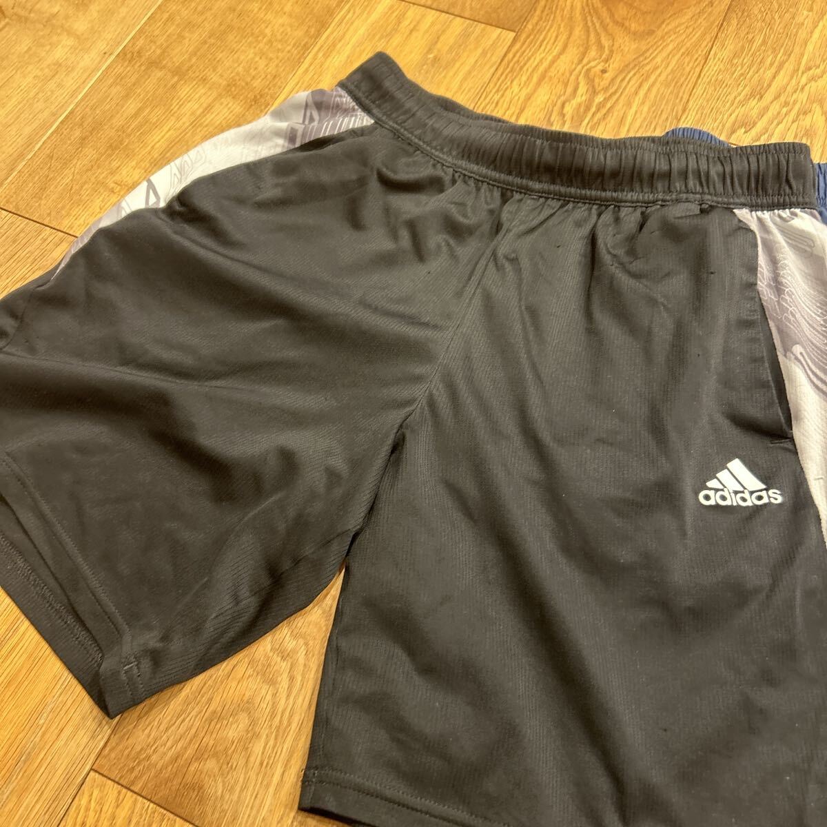 adidasの160サイズのスポーツ用ショートパンツ、黒と青のコンビネーション。