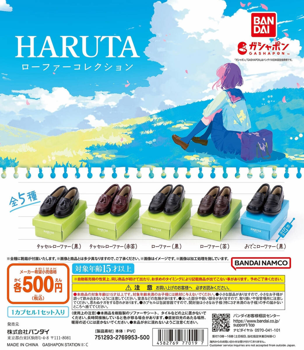バンダイから発売の「HARUTA ローファーコレクション」全5種のうち「おでこローファー(黒)」になります。500円ガチャだけあって小さなサイズながら箱、靴の細部まで精巧に造形されています。ビニールシート入り(最初から密封式ではありません)、リスト付きになります。