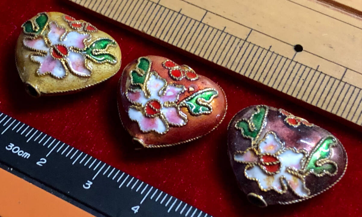 ¶!¶ 有線七宝焼ワールド - 3色(個)の大ハート型ペンダントa ¶!¶ 約厚9㎜×横22㎜×縦19㎜ 金線に三色釉 手作り 手芸 工芸 インテリア