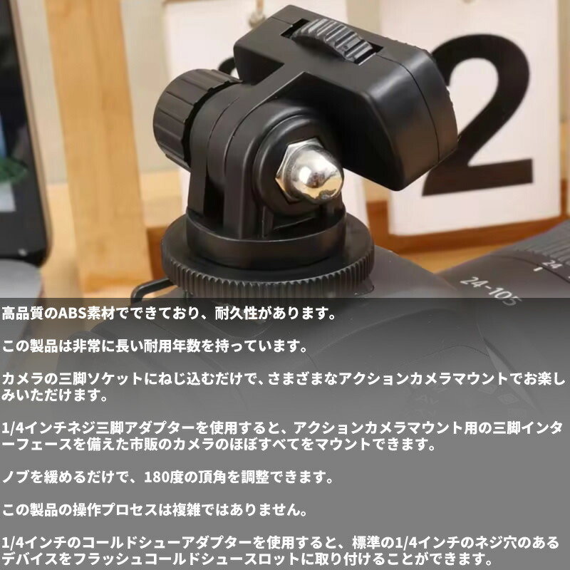 1/4インチのコールドシューアダプターを使用すると、標準の1/4インチのネジ穴のあるデバイスをフラッシュコールドシュースロットに取り付けることができます。