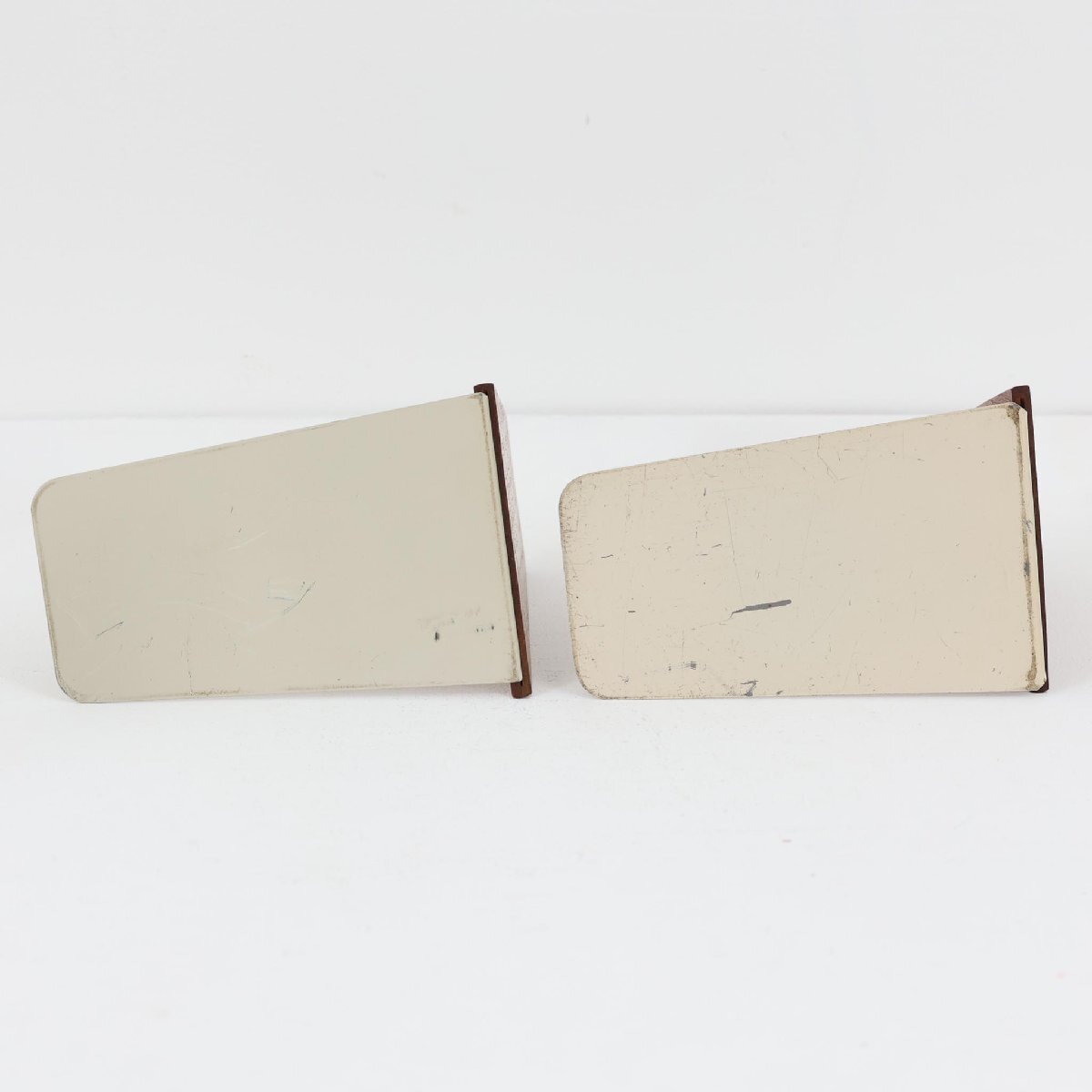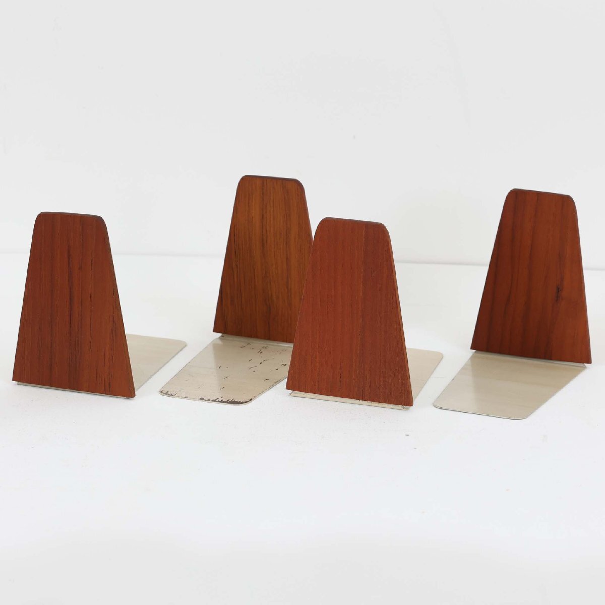 | コンディション | 木部には経年使用に伴うスレや小キズ、細かな欠け、補修跡などがございます。また、スチール部分にはキズや塗装の剥がれなど、目視ではっきりと確認できる程度のダメージが見られますが、ヴィンテージ品としては比較的良好なコンディションです。 可能な限り同様の形状・デザインのものを組み合わせてセットとしておりますが、傾きや大きさ、細部のディテールには若干の個体差がございます。あらかじめご了承ください。 スチール部と木部の接合部については、しっかりと固定されているものもあれば、やや緩みがあるものもございます。もし使用中に緩みが気になる場合は、スチール部にマスキングテープなどを巻いて厚みを調整していただくと、より外れにくくなります。 |