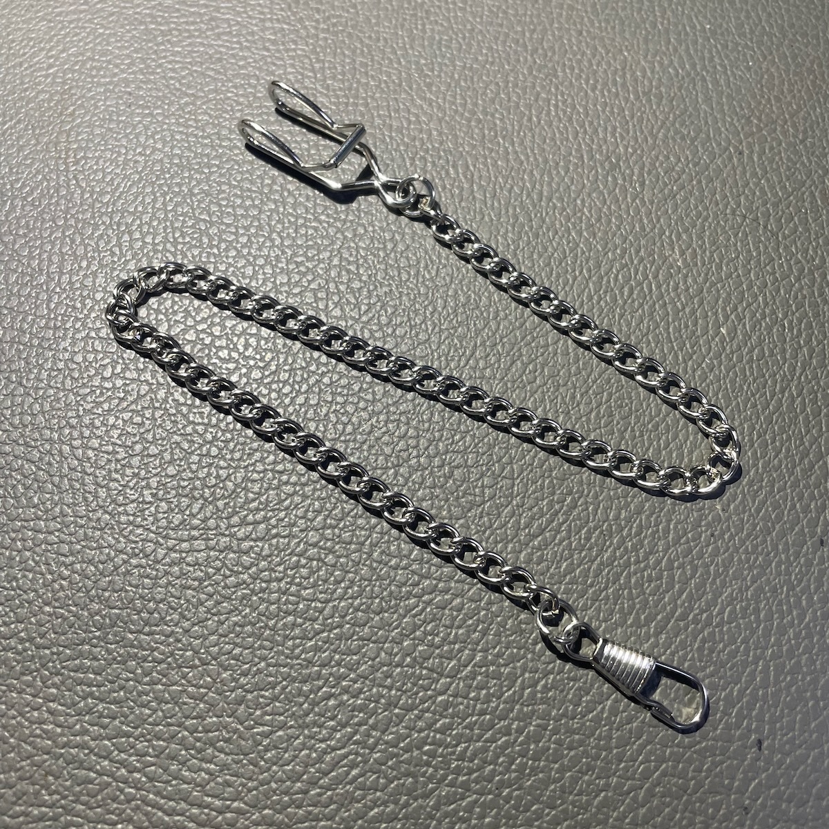 懐中時計用チェーン シルバー 懐中時計を引っ掛ける側のパーツと 服に留めるためのパーツが片側に付いています。 38cm、12gです。 普段使いにもコスプレにも。