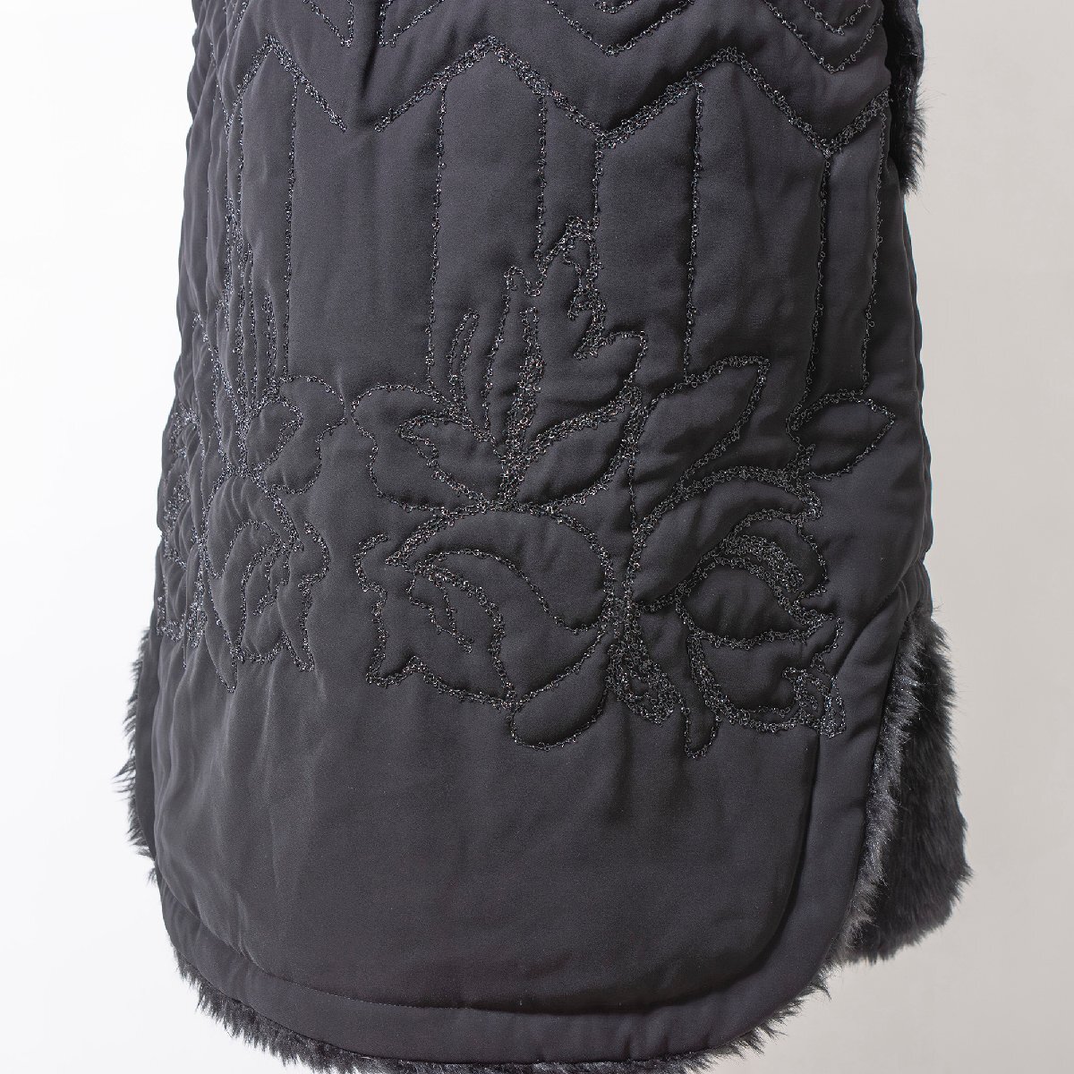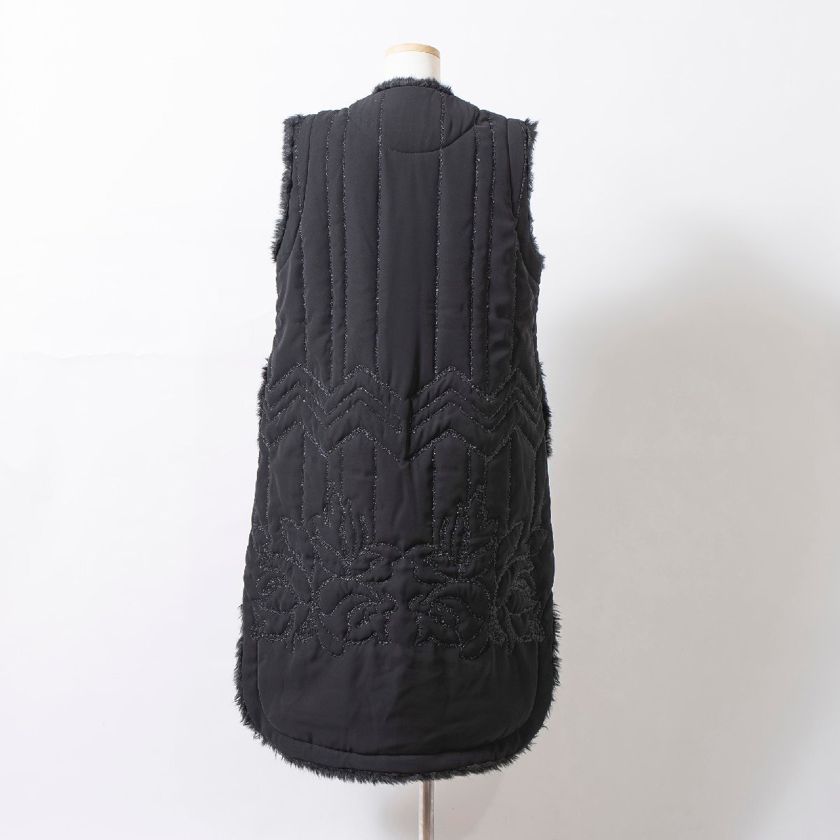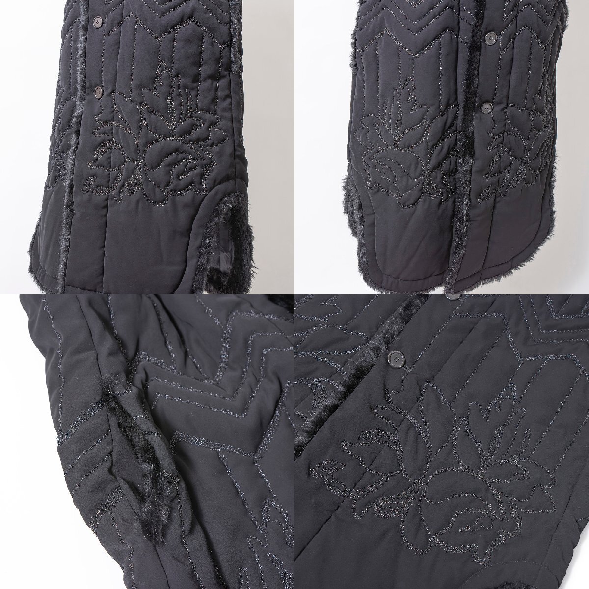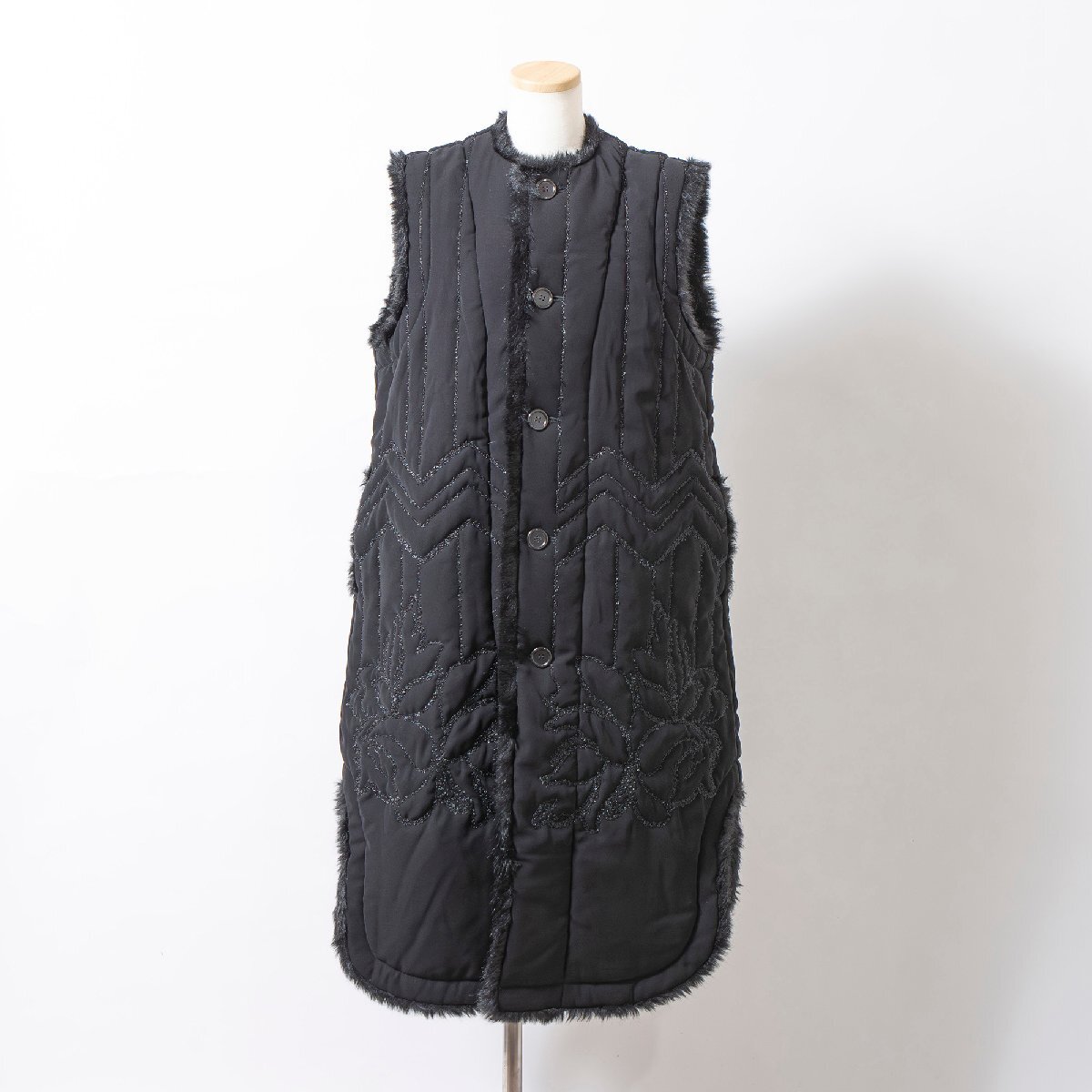 本品はフラワーモチーフのキルティング刺繍を全面に施した、アートピースのようなロングベスト。 アームホールや裾のフェイクファートリミングが柔らかな陰影と高級感を添え、シンプルなブラックながら重層的なテクスチャーが印象的。 トップスに重ねるだけで、洗練されたモードスタイルを演出します。 ■おすすめのコーディネート