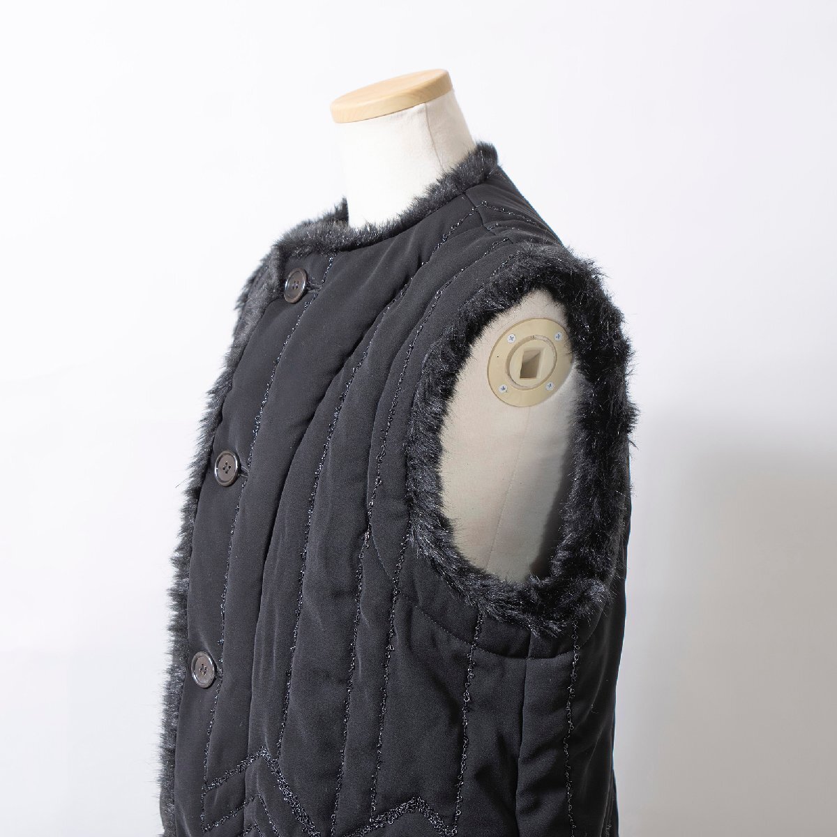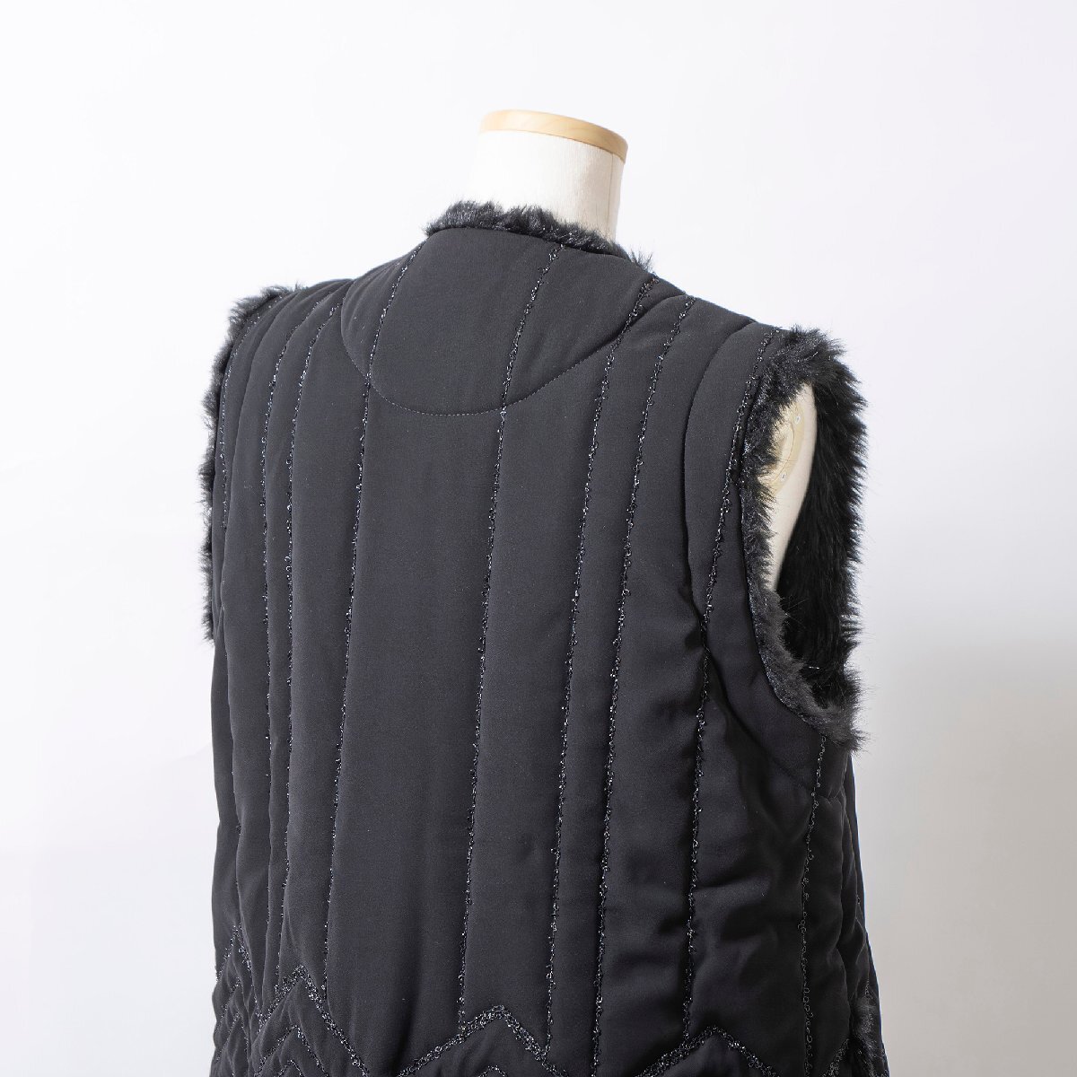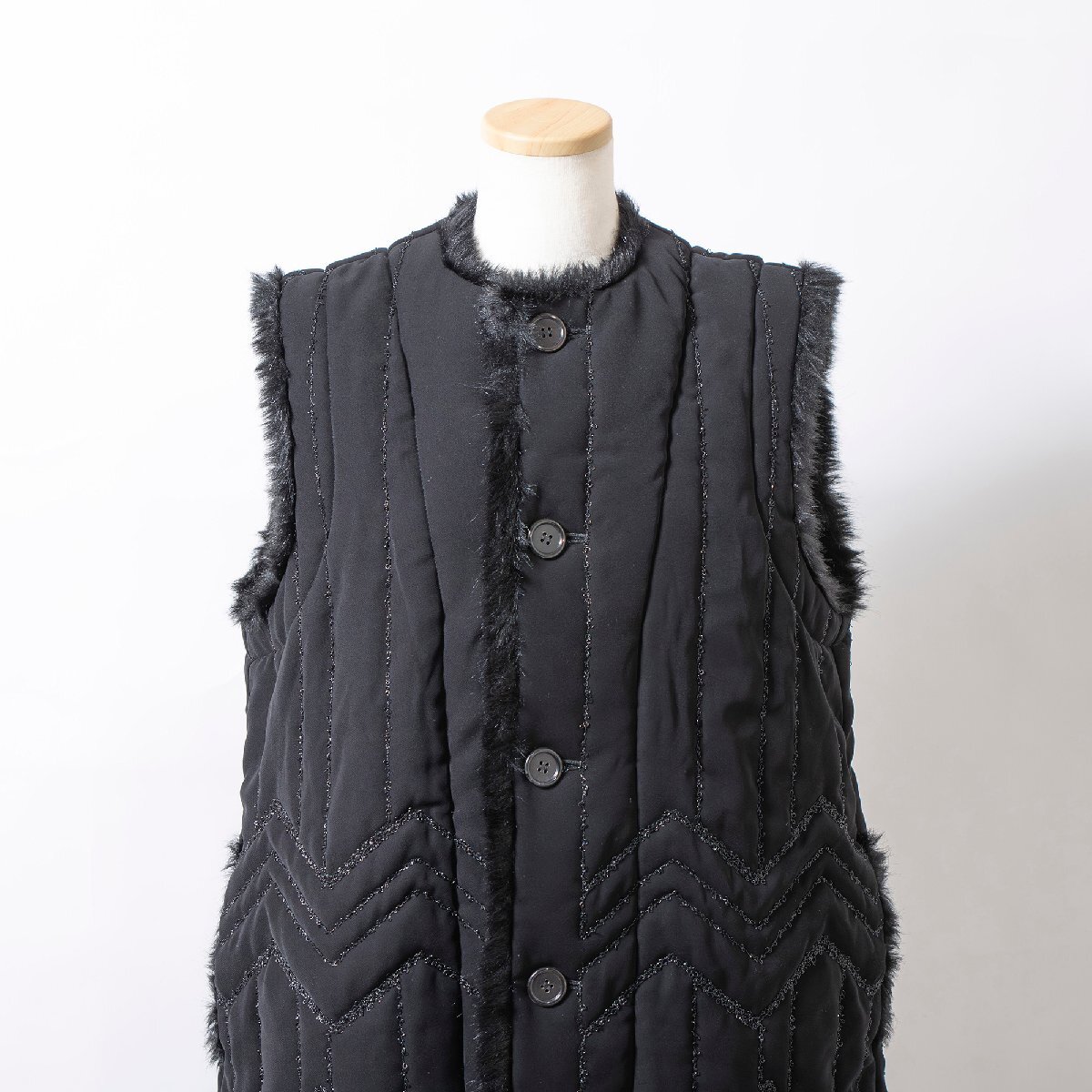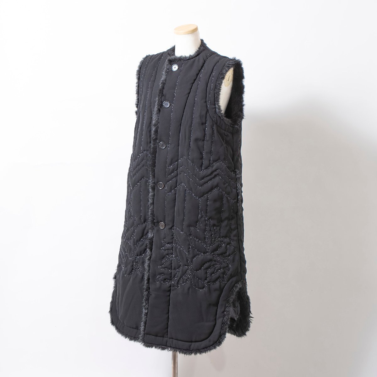 本品はフラワーモチーフのキルティング刺繍を全面に施した、アートピースのようなロングベスト。 アームホールや裾のフェイクファートリミングが柔らかな陰影と高級感を添え、シンプルなブラックながら重層的なテクスチャーが印象的。 トップスに重ねるだけで、洗練されたモードスタイルを演出します。 ■おすすめのコーディネート