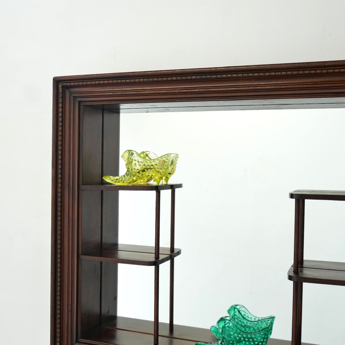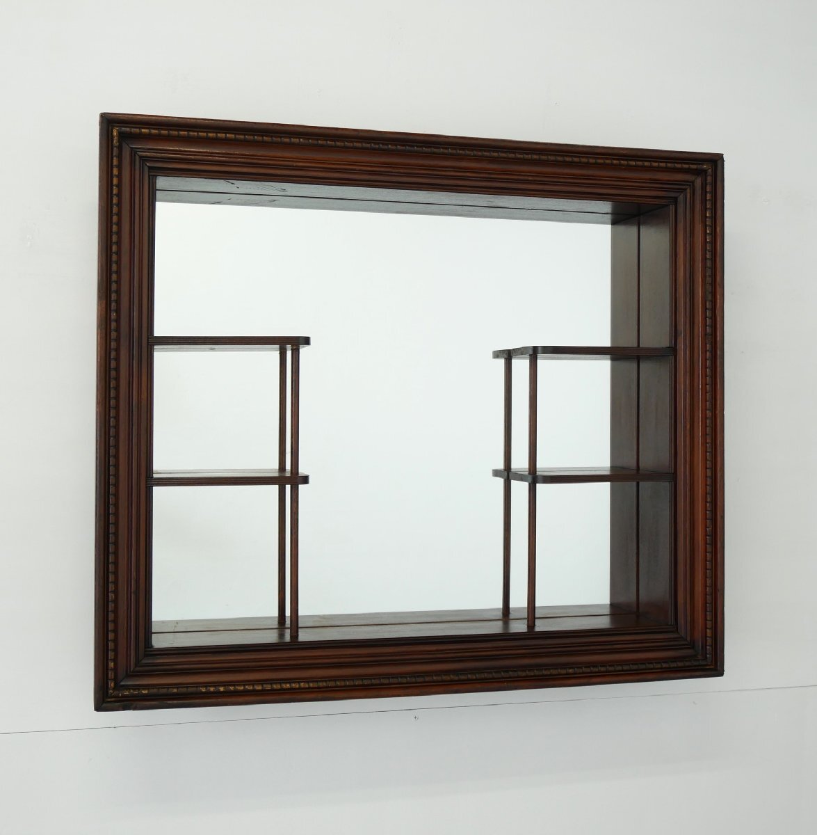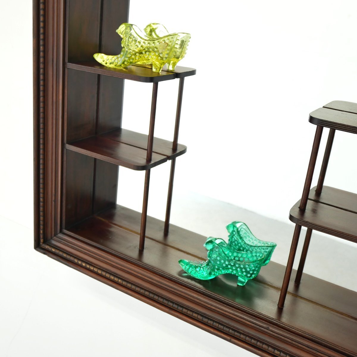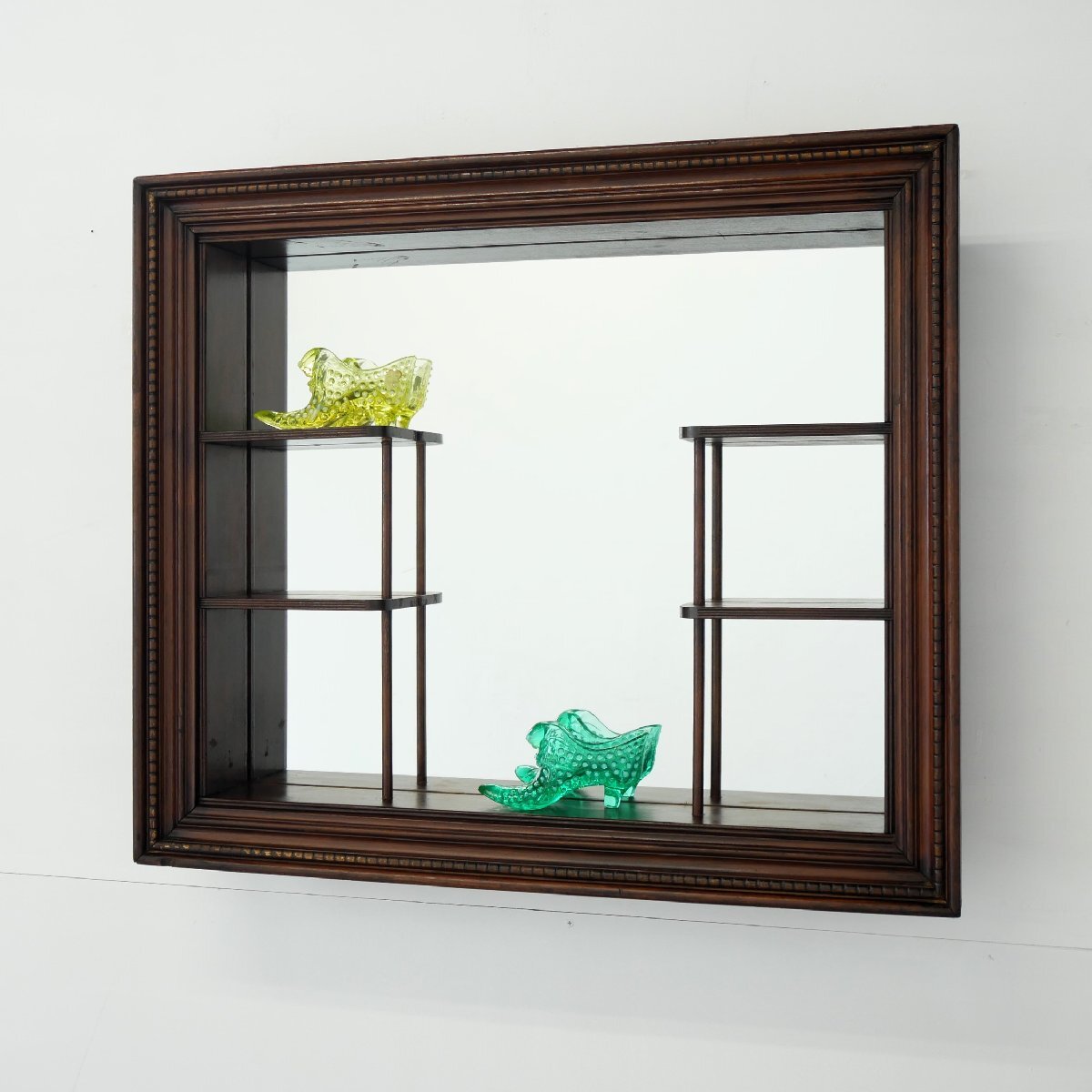 | 商品説明 explanation | 1950年~60年代頃の木製壁掛けラック(シャドーボックス)です。 棚板がほどよく配置してあり、背面は鏡になっています。 壁面のディスプレイ棚にいかがでしょうか。 壁面に設置の際は壁にビスなどでしっかり固定してください。 ガラスの靴の置物は対象外です。 |