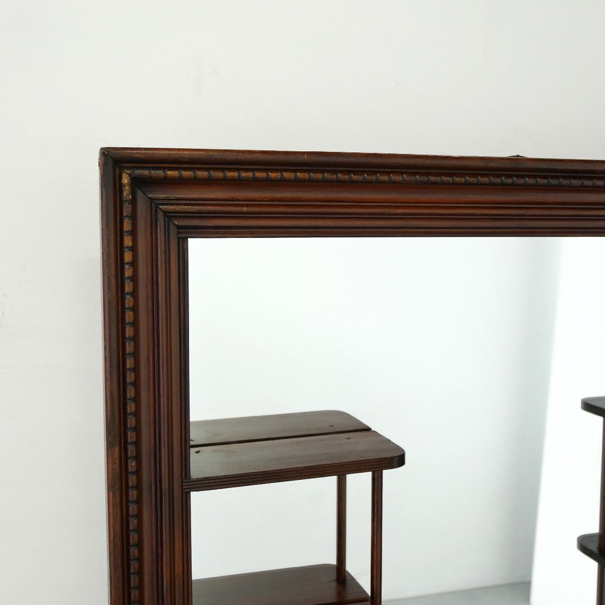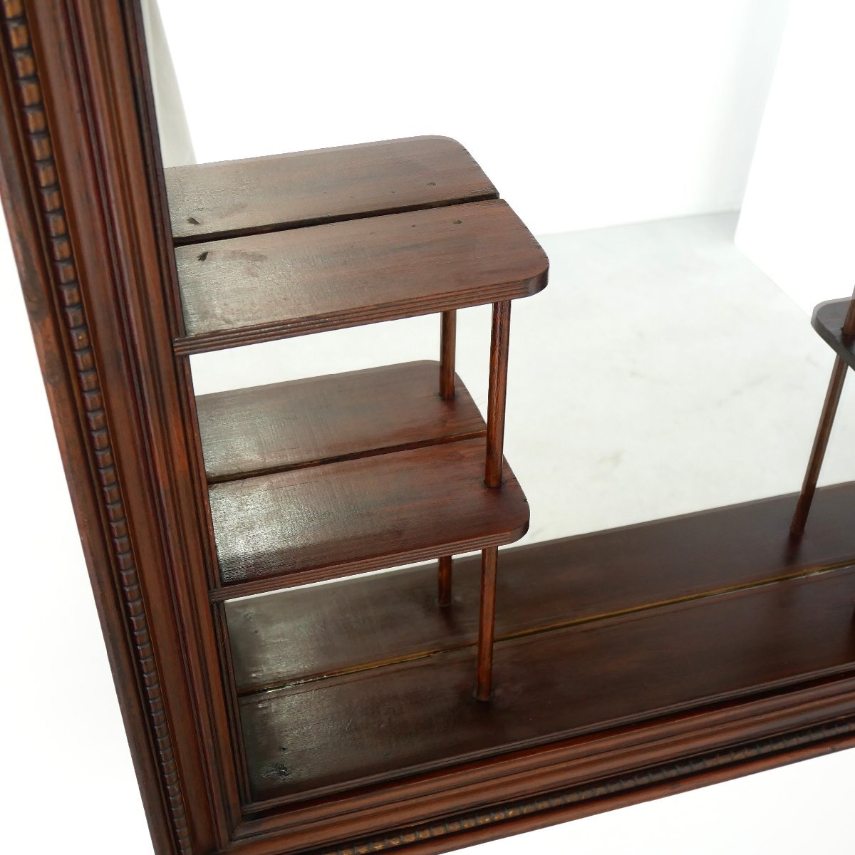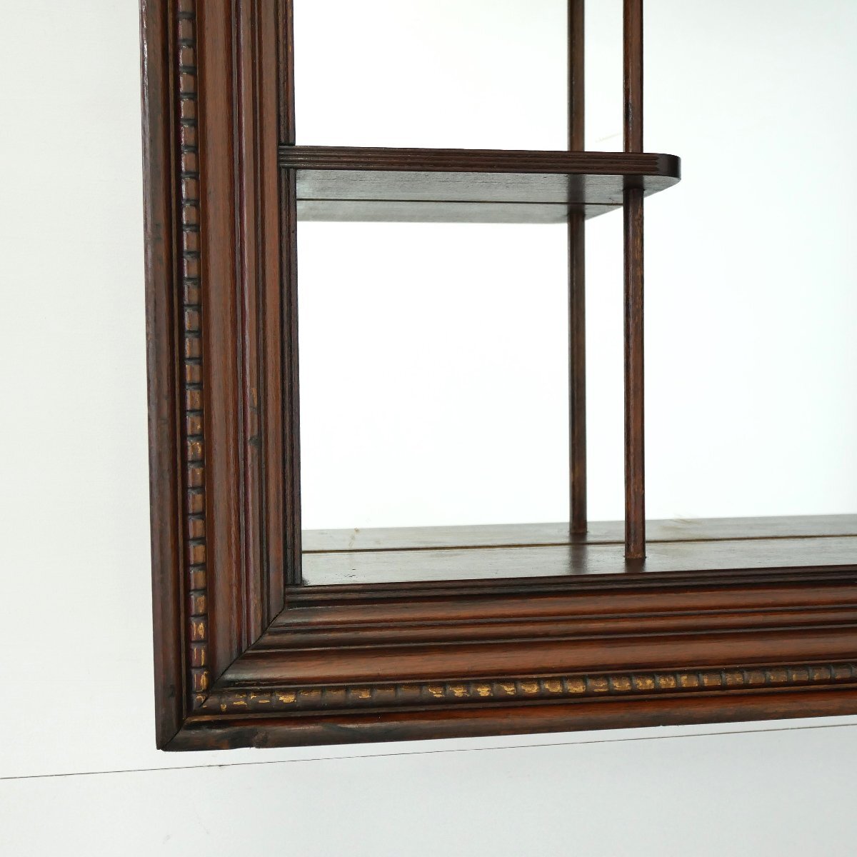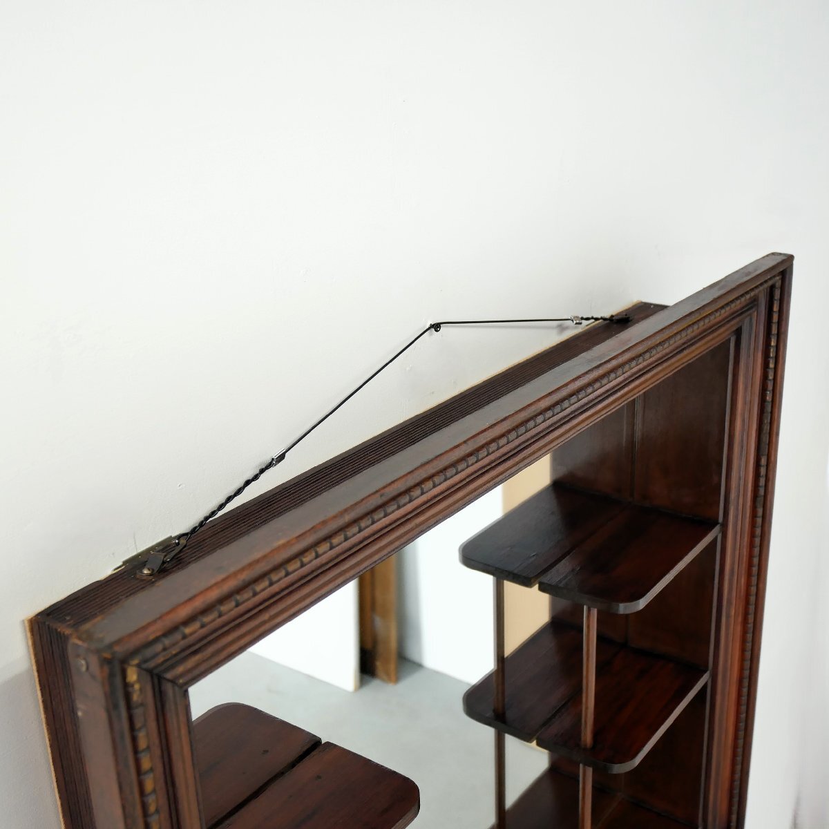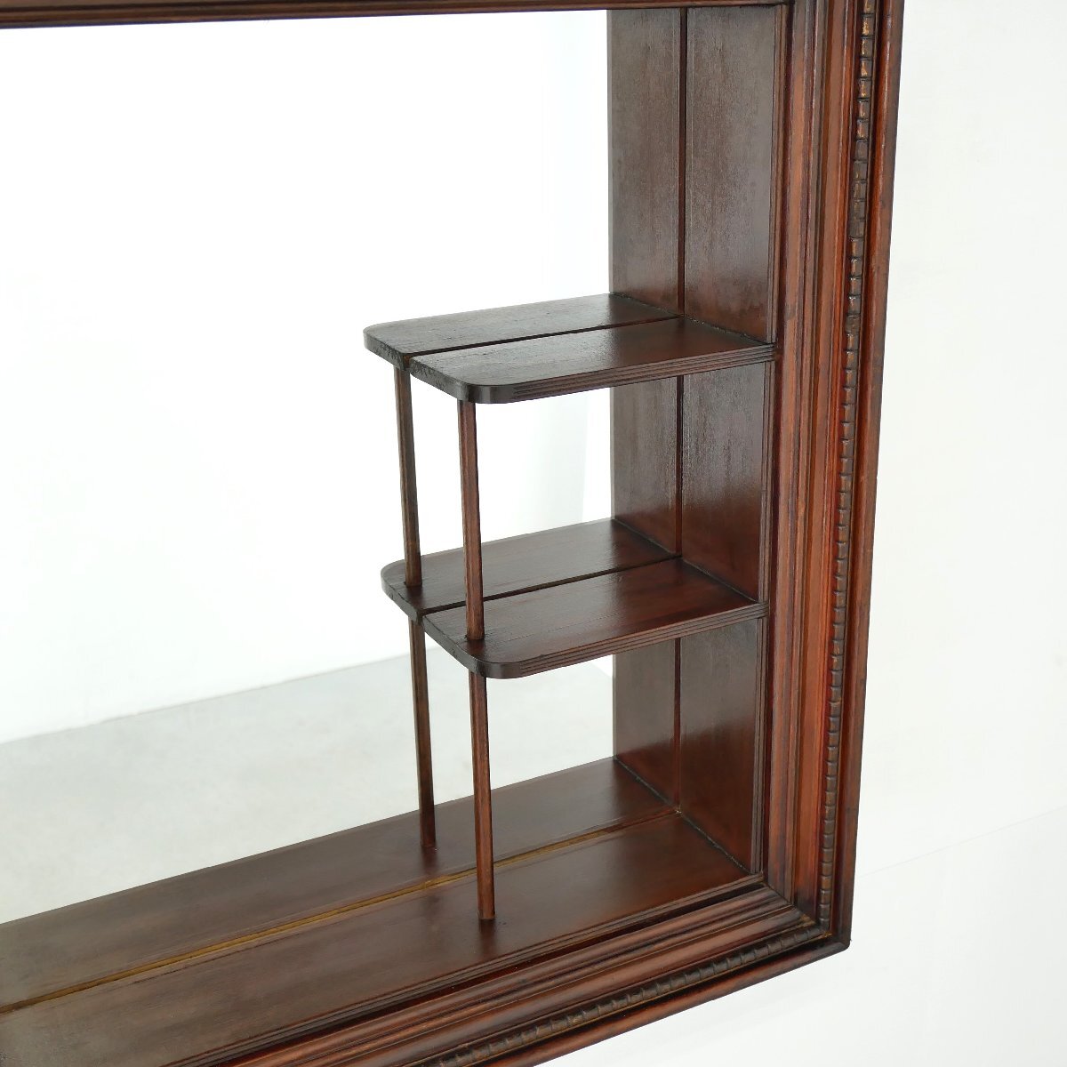| 商品説明 explanation | 1950年~60年代頃の木製壁掛けラック(シャドーボックス)です。 棚板がほどよく配置してあり、背面は鏡になっています。 壁面のディスプレイ棚にいかがでしょうか。 壁面に設置の際は壁にビスなどでしっかり固定してください。 ガラスの靴の置物は対象外です。 |