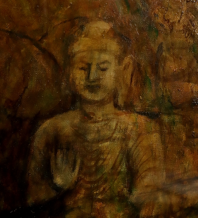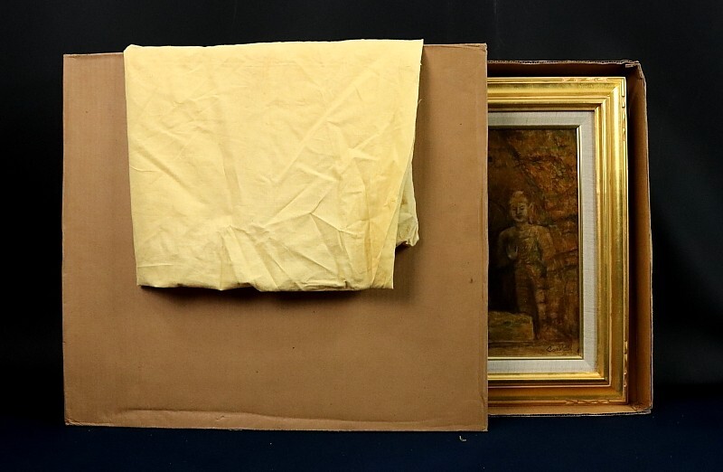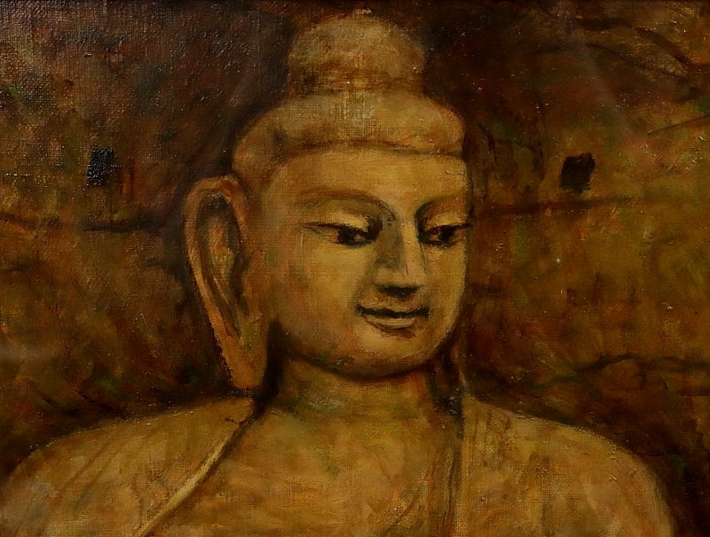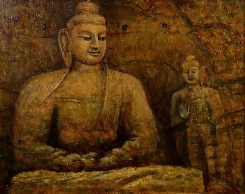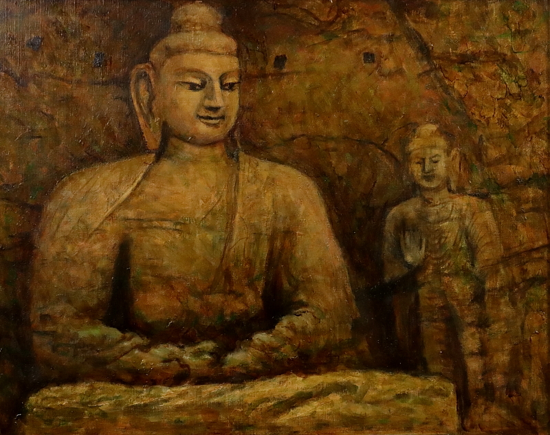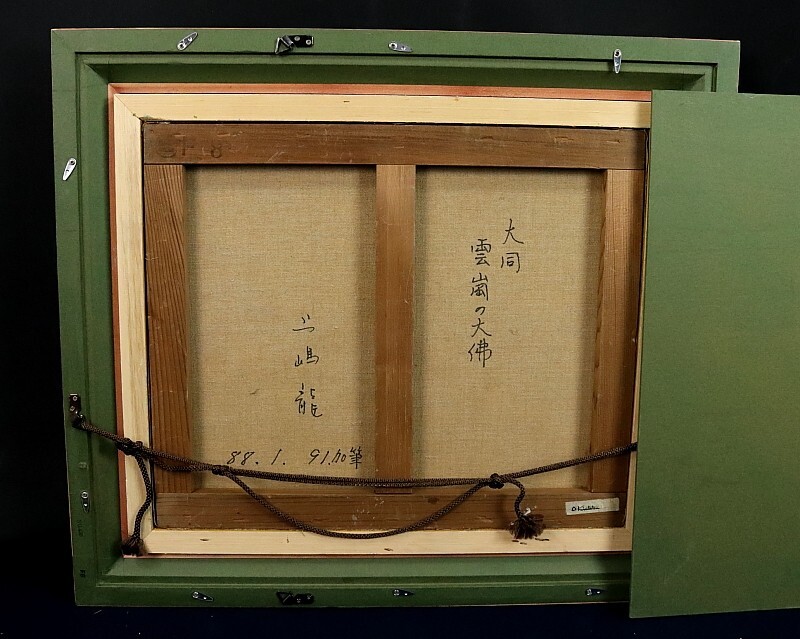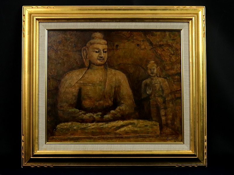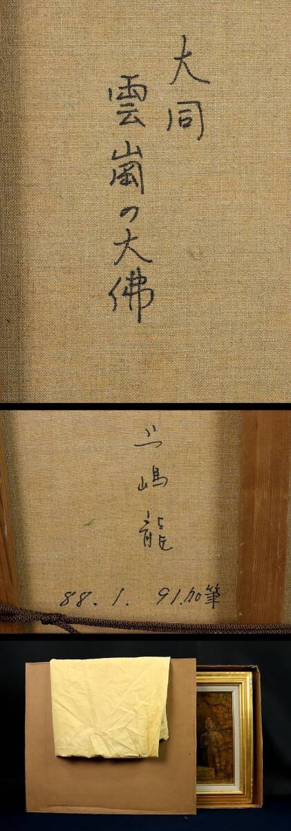 11165■【真作】上嶋龍 「大同 雲崗の大佛」 キャンバス F8号 油彩 創造美術協会 奈良の人 額装