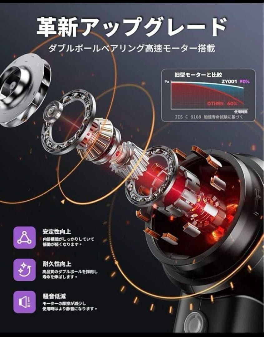 ダブルボールベアリング高速モーター搭載。内部の流線型エアダクト設計により、風速を最大化し、吸引効率を大幅に向上させました。