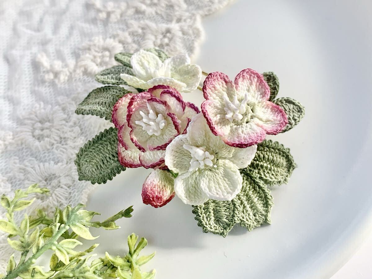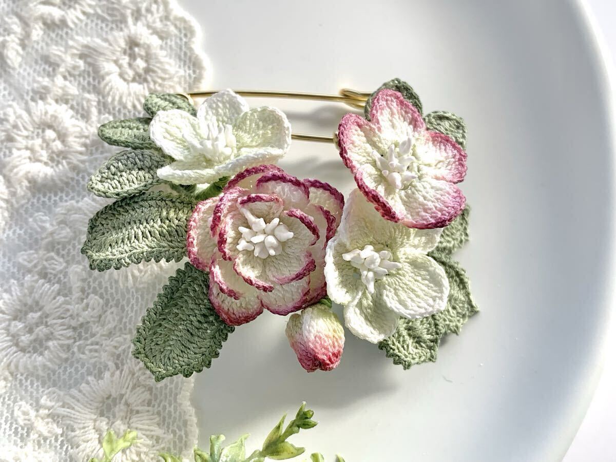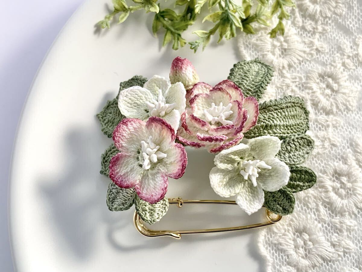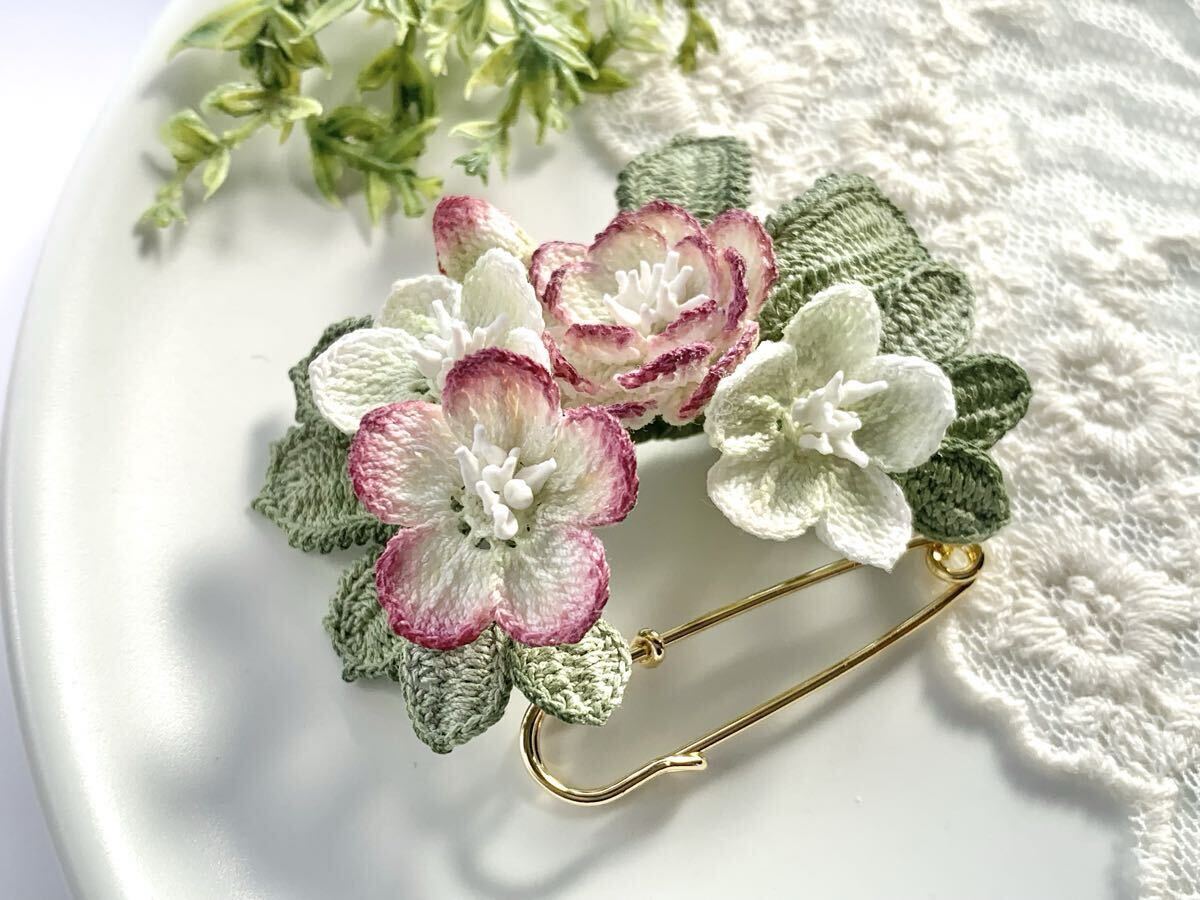 白い80番レース糸で編んだモチーフを着色してブローチに仕立てました。
