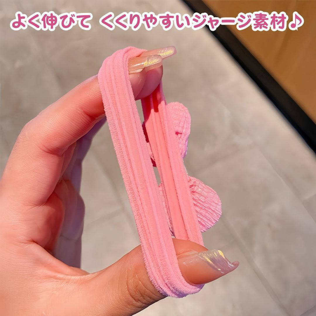 柔らかくてよく伸びるジャージ素材で、髪に優しく、結びやすくて痛くなりにくいのが特徴です。