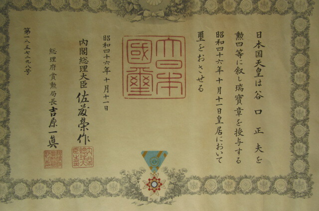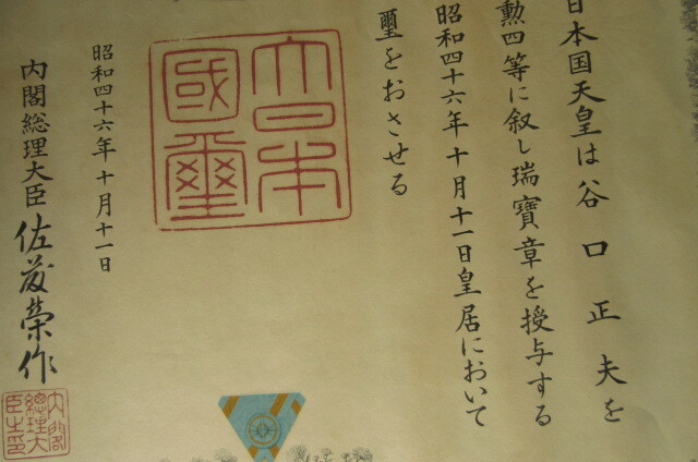 横綱玉の海の逝去に際して、佐藤総理大臣よりの褒章です。玉の海の遺族より入手しました。玉の海の没後50年に際し手放します。大事に保存して下さる方に入札をお願いします。大きさはタテ42センチ。ヨコ59センチです。玉の海の横綱土俵入りの大写真を付けます。大きさはタテ44センチ、ヨコ56.5です。両方丸めてヤマト便着払いで送品します。。