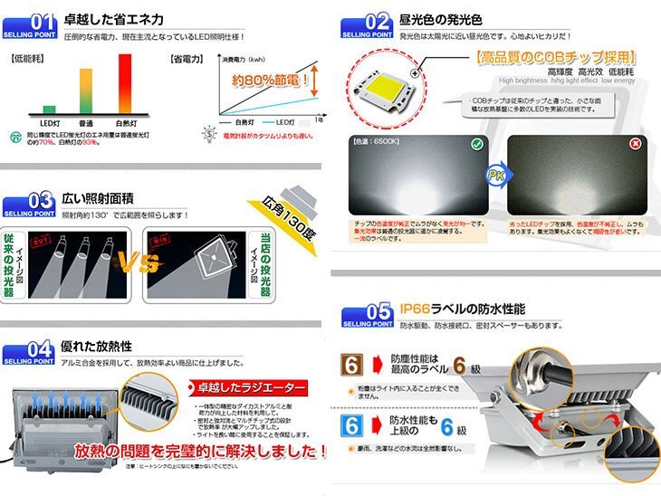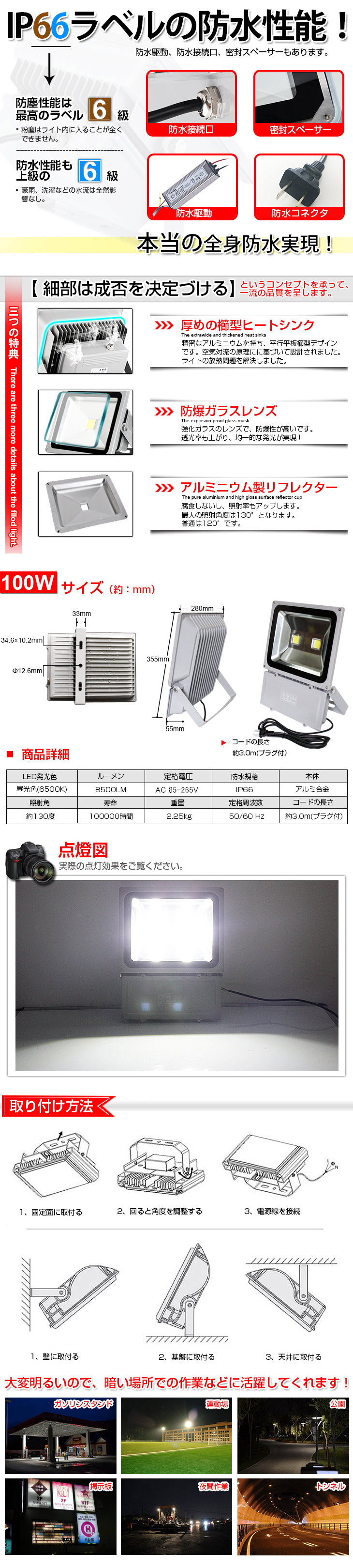 ◆LED採用の省エネ投光器ライト: 100Wと省電力で、従来の1000W相当の明るさです!IP66規格の防水仕様!屋内·屋外両方ご利用OK!また倉庫用の照明·集魚灯·看板灯など用途は様々! ◆カバーは強化ガラス: 普通のガラスの4~5倍の強度を持つ強化ガラスを採用、光線の透過率は大幅アップします。透過率は98%以上に達する! ◆放熱性のいいアルミ合金: アルマイト処理のアルミ採用することで、放熱性を更なる段階に引き上げ!耐熱範囲内の正常な働きを保ちます。 ◆角度調整可能: ライトは柔軟な角度調整機能を持ってます。使い方も非常にカンタン! ◆驚きの長寿命: 本製品は100000時間以上の長寿命で、他の商品の2000時間を遥かに凌駕します。 ◆ファッションの設計: アルミ合金のボディ、グレーの外観は高級感が持ってます。 ◆広い使用範囲: トンネル、掲示板、ガソリンスタンド、夜間作業、現場工事、駐車場、公園、運動場にも様々な場所で活躍します!公園、運動、屋外や現場作業にも便利です!特に、夕暮れ時夜間作業にとても役立ちます! 虫が集まりにくいの も魅力です。 【保証】 ◆当商品は12っヶ月保証となります。 ◆お届けから1週間以内にご連絡のあった不良品の保証対応の送料は当方が負担いたします。 ◆保証期間内の不良品ですが、交換のみ対応しております。往復送料はお客様負担となります。在庫がない時だけ返金しますので、ご了承ください。 |