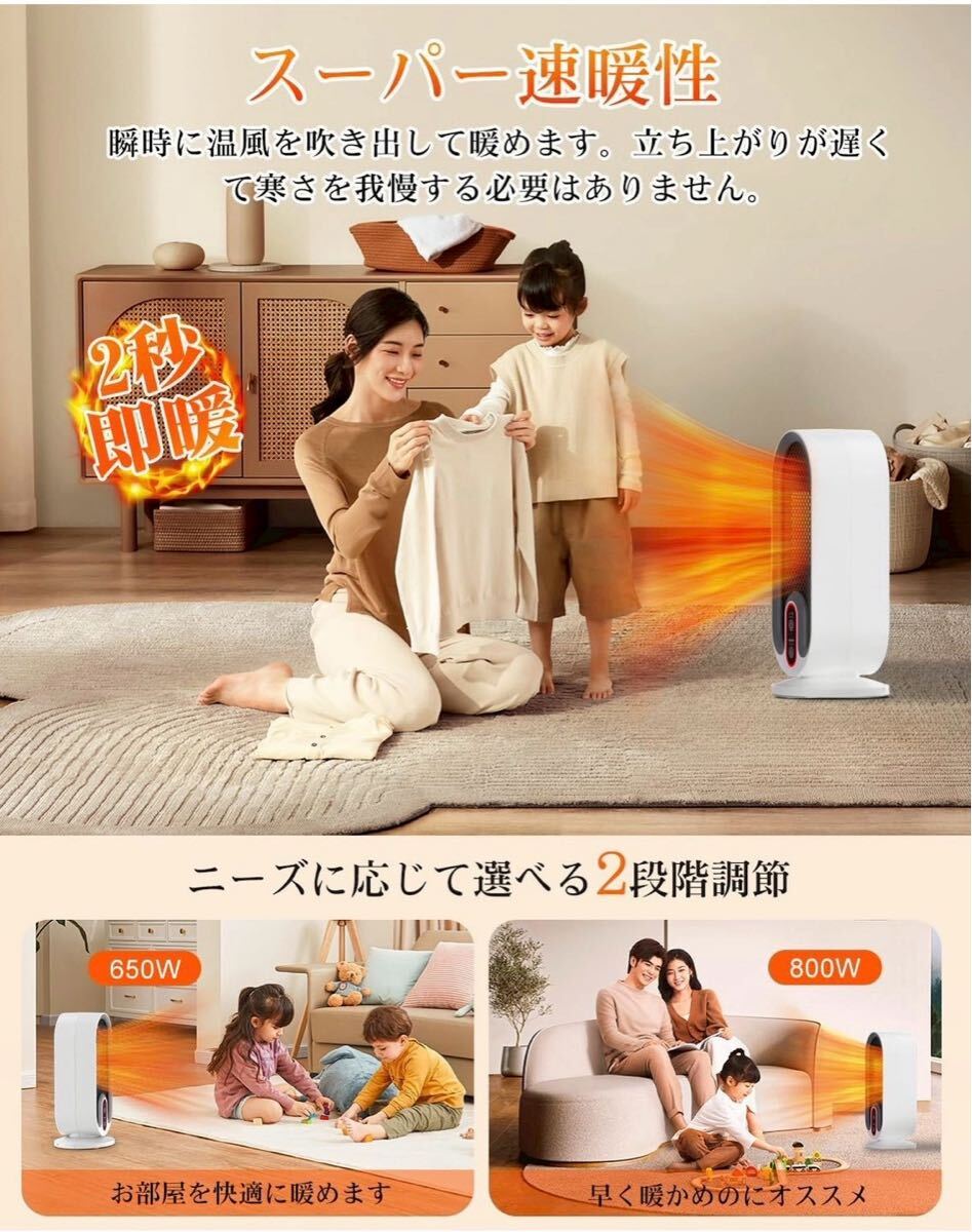 電気ファンヒーターは電熱転換率の高いPTCセラミックを搭載、ただ2秒で温風を吹き出して暖めます。立ち上がりが遅くて寒さを我慢する必要はありません。800wの強風モードは足元が冷える時や部屋が中々温まらない時に最適で、650wの弱風モードも部屋を快適に暖めます。風力を簡単切替、暖まり具合の応じてお好みの風量でお使いいただけます。
