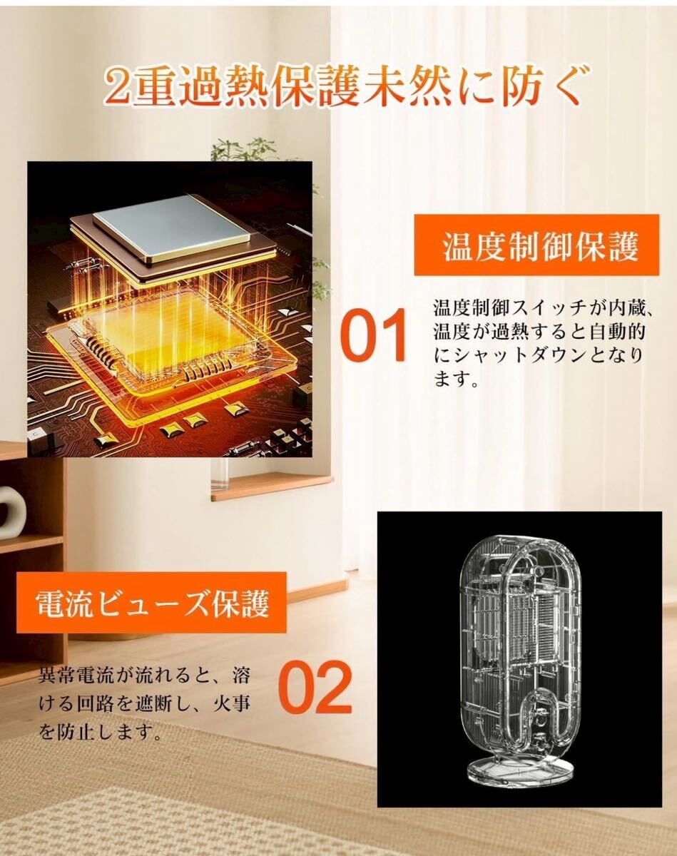 ガスや石油を使わない「非燃焼系」の暖房器具で、燃料を燃やした時の嫌な匂いや有毒ガスを発生しないので、換気などが必要無く、直接火を使わない、火事などのリスクが少ないです。電気ヒーターはV0級難燃安全素材を採用、転倒時自動で電源が切れる「転倒自動OFF機能」、吹き出し口を塞いでしまっていたり、連続運転時など異常な温度上昇を感知する「過熱防止機能」、24時間運転すると自動で電源が切れる「切り忘れ防止機能」も搭載され、安全面に配慮されています。