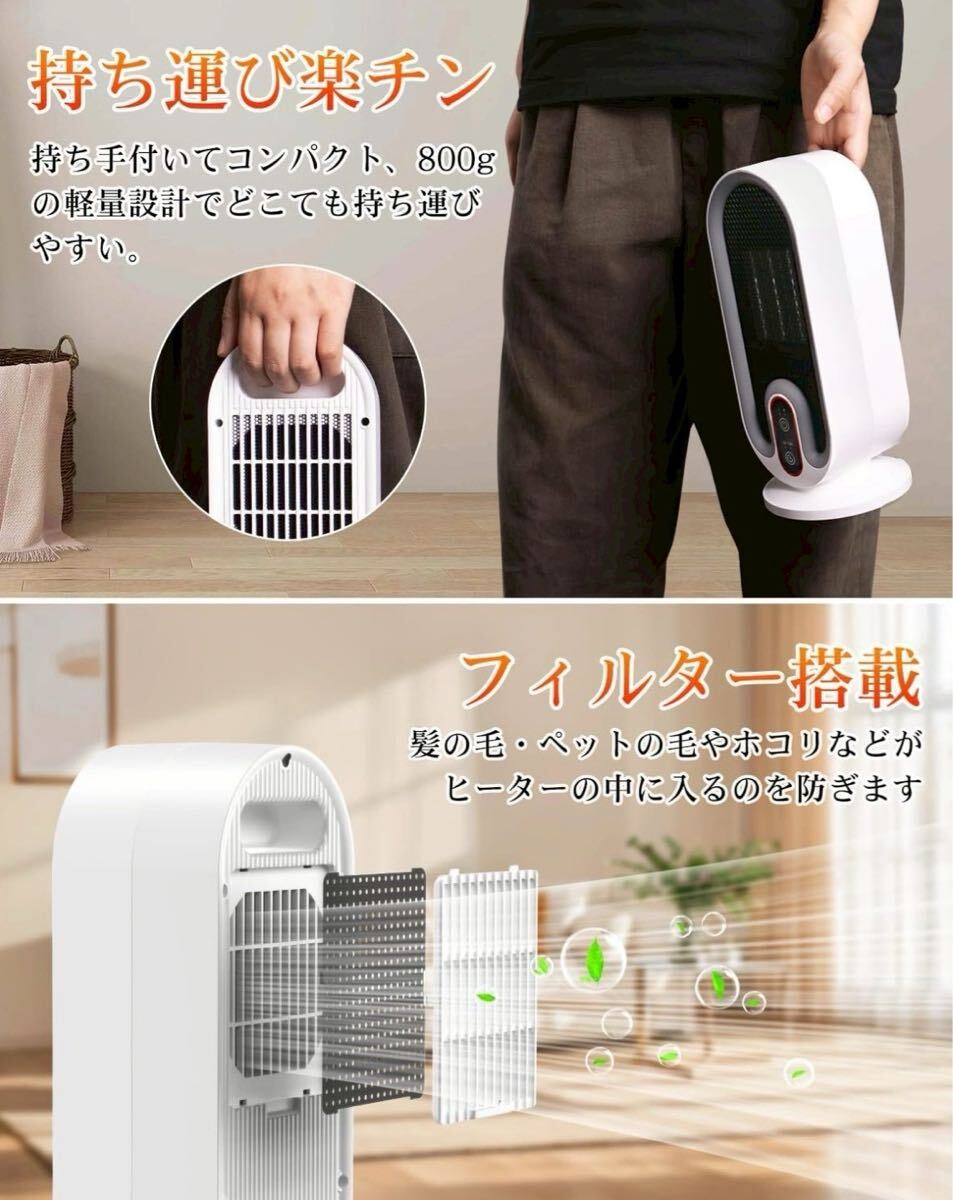 電気で加熱した温風を送り出すセラミックファンヒーター。脱衣所やトイレ、机の下などエアコンの風が届かず寒くなりがちな場所で、手軽に使いやすい暖房器具です。2秒で暖かく、寒い屋外から入ってきても待つことなくすぐに温もりを感じられます。高性能フィルターが付き、多重の安全保護機能も搭載しており、あなたとご家族を温めるだけでなく、電気の安全も守ります。
