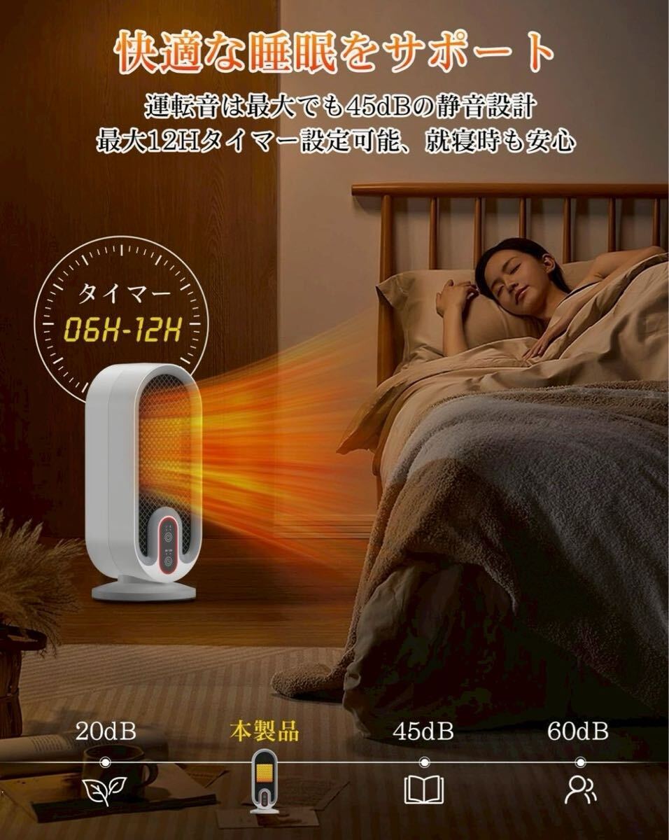 ヒーターサイズは12×12×27で、ボディ自体もスリムでコンパクトなサイズ感なので、トイレなどの狭い場所でのスポット暖房としても使えます。インテリアに馴染みシンプルな設計なので、足元や卓上にもピッタリ置けるミニ温風ヒーターです。
