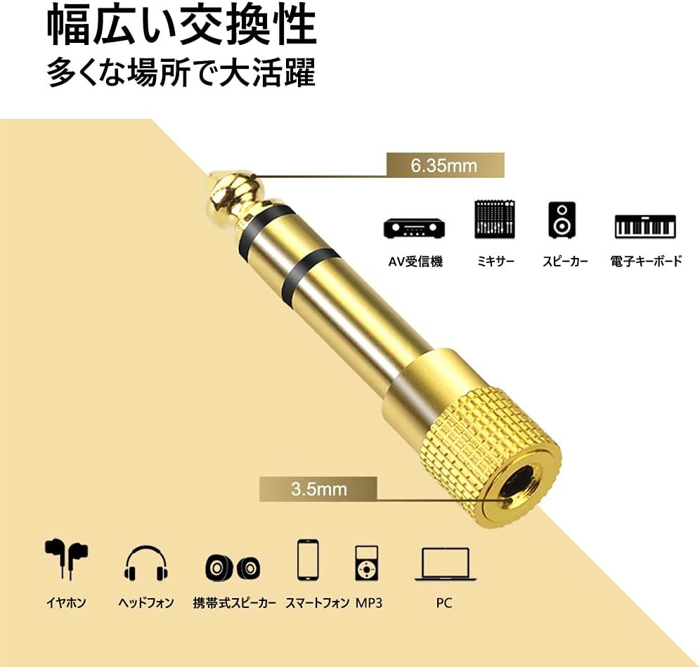 片側:3.5mmステレオミニ(メス)- 片側:6.3mmステレオ標準プラグ(オス)、ハイグレード金メッキ仕様、RoHS指令対応