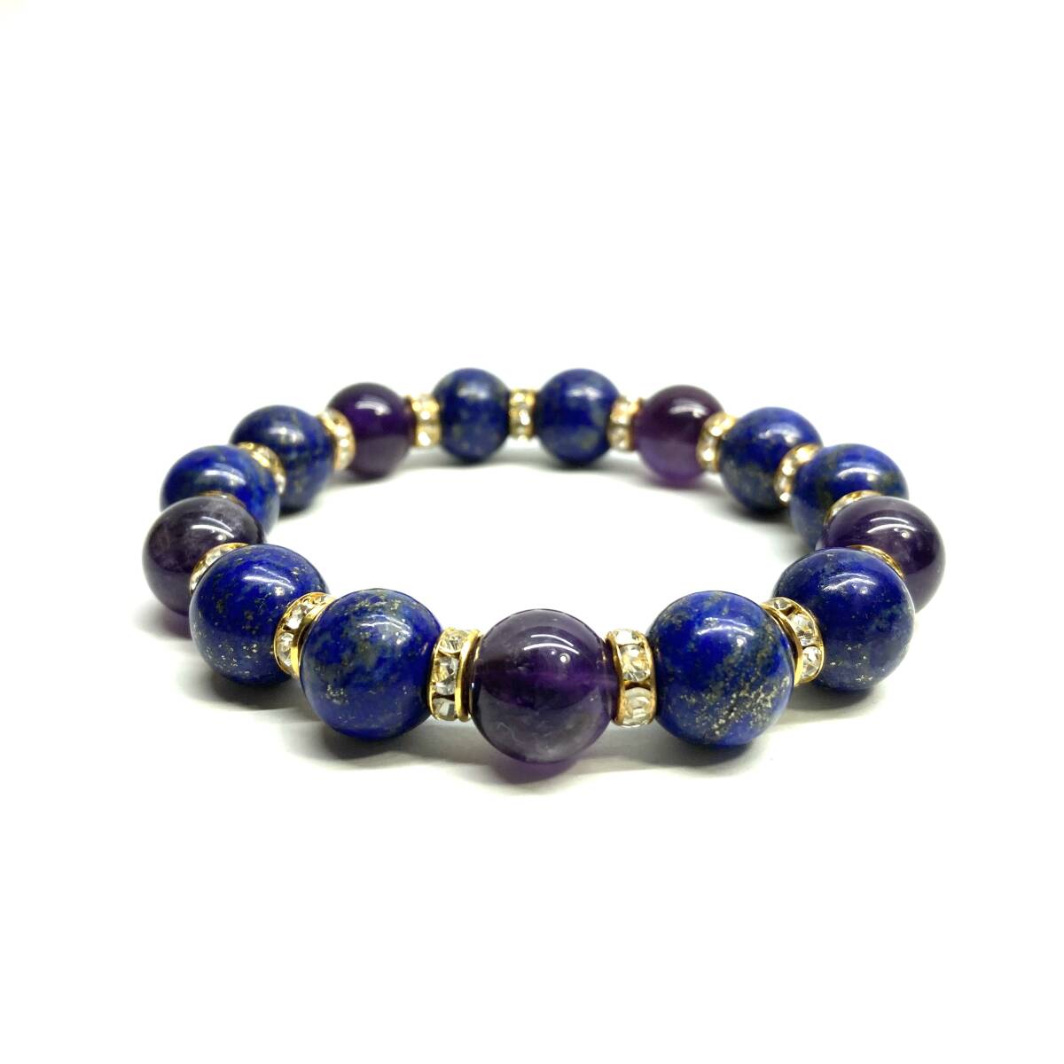 こちらは、ラピスラズリとアメジストを組み合わせたパワーストーンブレスレットです。間にはロンデルを挟み高級感あるデザインに仕上げております。程よくインパクトがある12mm玉を使用して内周約18cmです。(サイズ変更の場合は取引ナビにてご連絡をお願いします。) 数に限りがございますので気になる方はお早めにどうぞ。