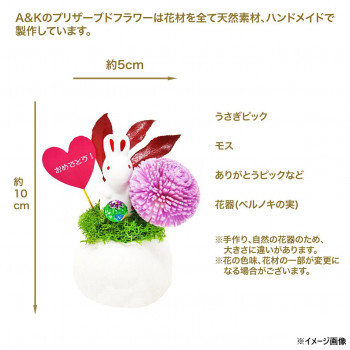 | お手入れなしで美しい状態を保つことができるプリザーブドフラワーです。かわいらしいうさぎピックがデコレーションされています。おめでとうピック付きなので、お祝いの贈り物におすすめです。花器はベルノキの実をくりぬいてつくりました。 ※手作りのため、大きさに違いがあります。 ※花器は果実をそのまま使用しているので、大きさは不揃いです。 ※花の色味、花材の一部が変更になる場合がございます。 |