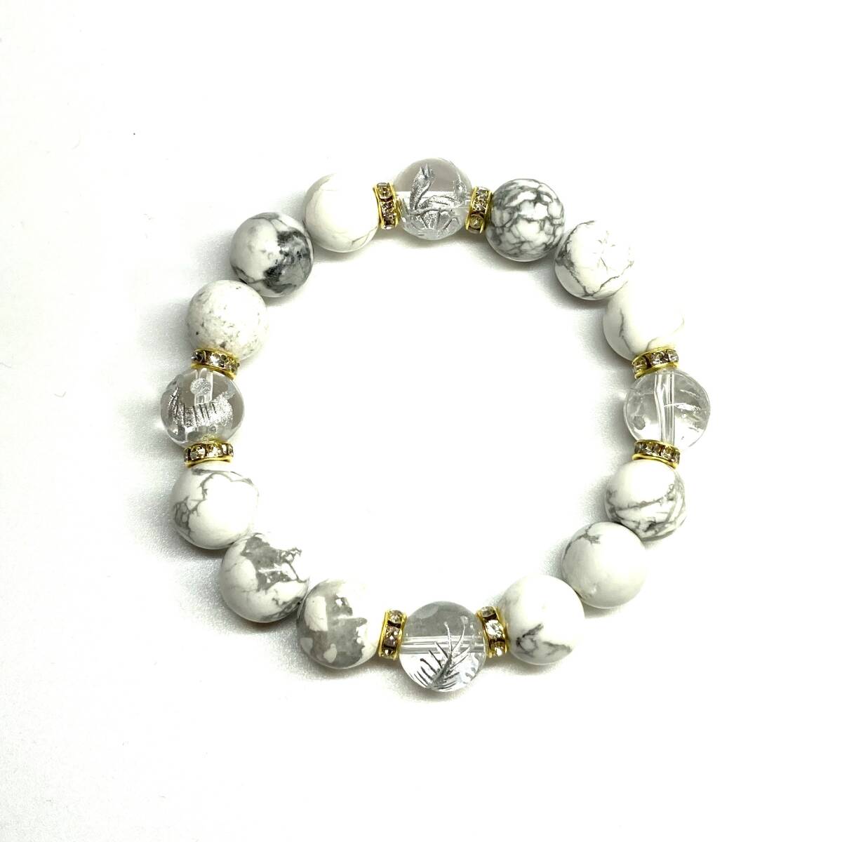 こちらは、四神獣銀彫水晶とハウライトを組み合わせたパワーストーンブレスレットです。四神獣は、中国の伝説で4つの方向(東西南北)を守護する神聖な神。四神獣、厄災から身を守り、多くの運気を呼び込むと言われております。石大きさは程よくインパクトのある12mm玉で内周 約17cmです。 数に限りがございますので気になる方はお早めにどうぞ。