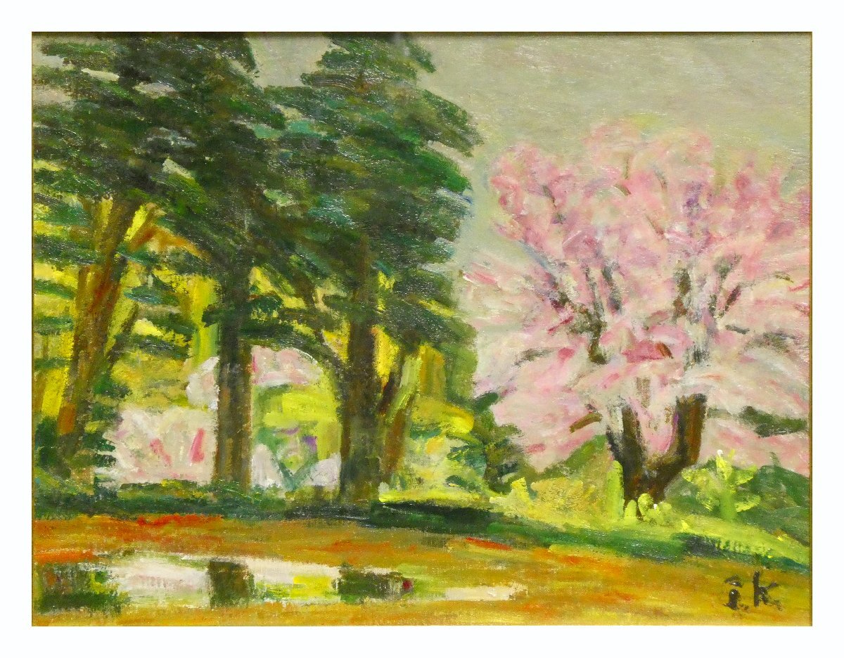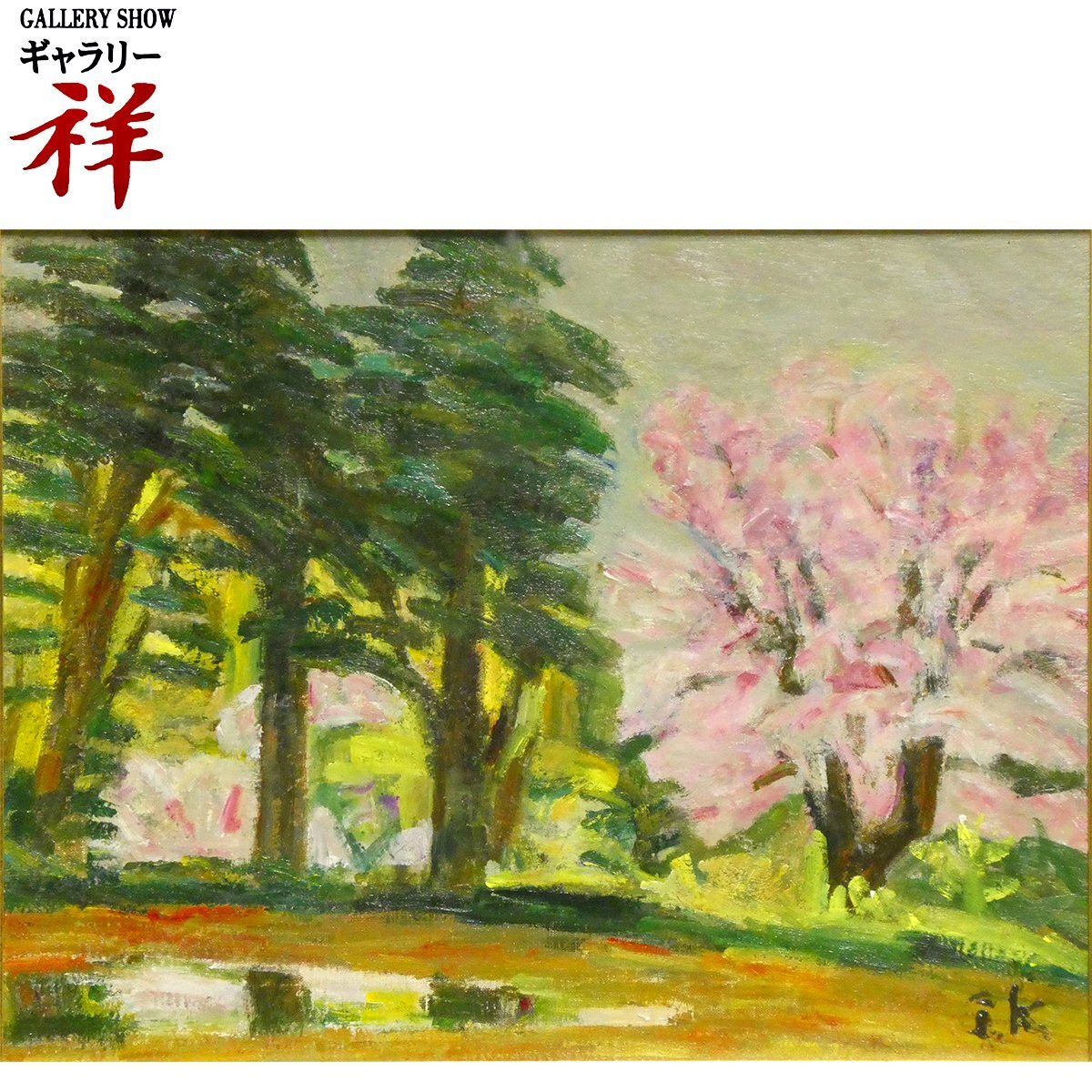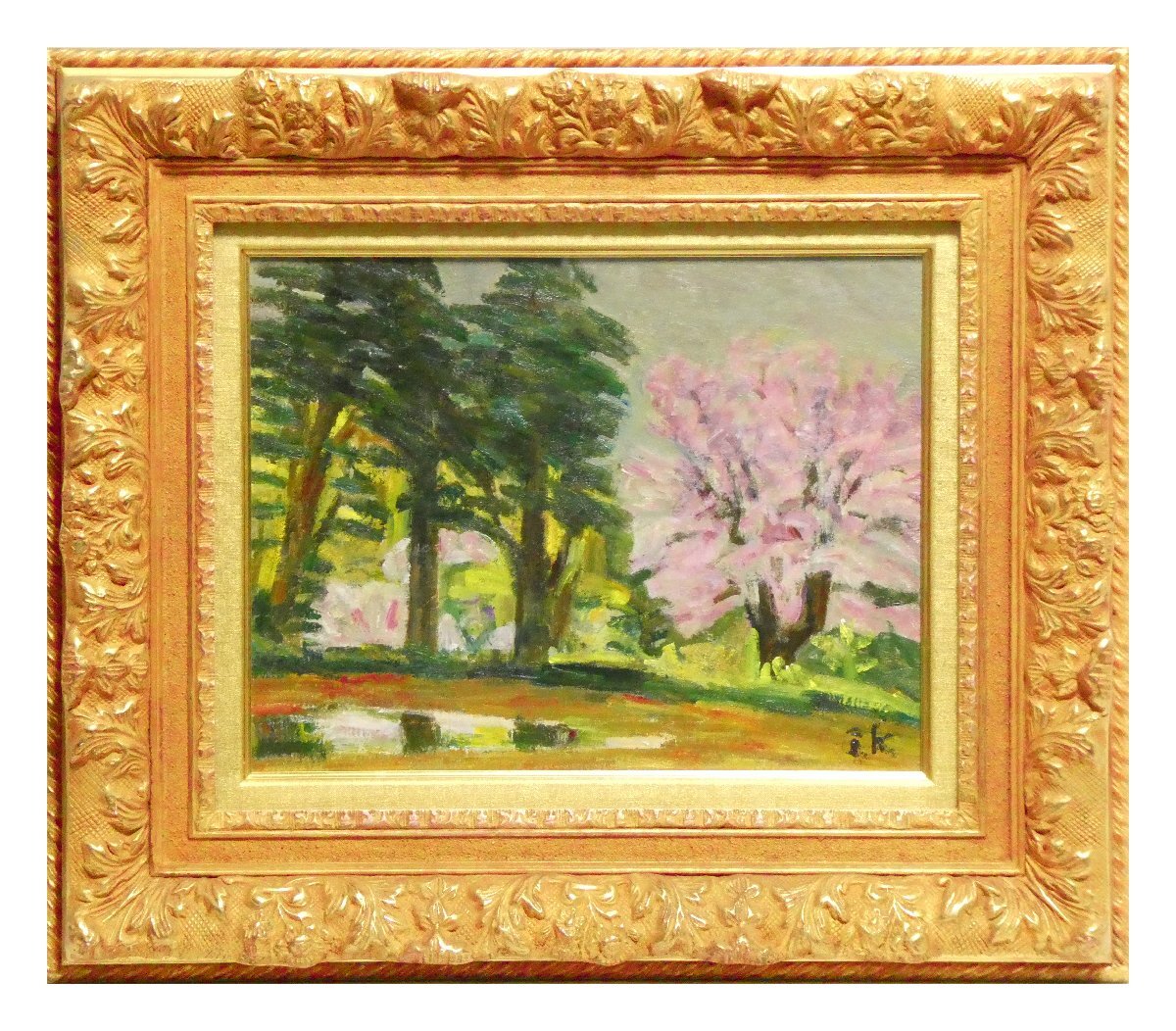 力強い筆触・コントラストの強い色彩・簡潔なフォルムなど、独特の作風で知られる小絲源太郎画伯。 満開の桜の木が描かれた春の風景の、水たまりに映った木々までもが輝いて見える、生命力にあふれた作品です。 |
