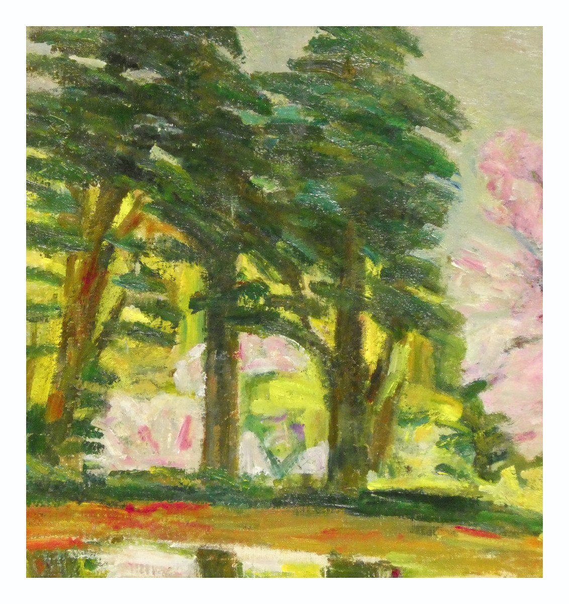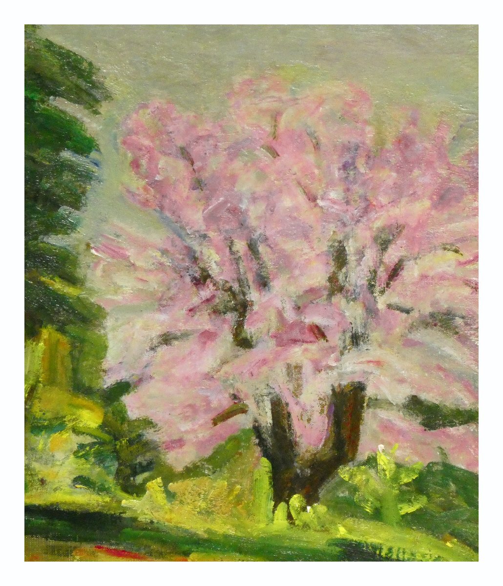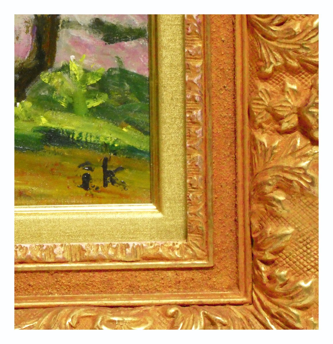力強い筆触・コントラストの強い色彩・簡潔なフォルムなど、独特の作風で知られる小絲源太郎画伯。 満開の桜の木が描かれた春の風景の、水たまりに映った木々までもが輝いて見える、生命力にあふれた作品です。 |