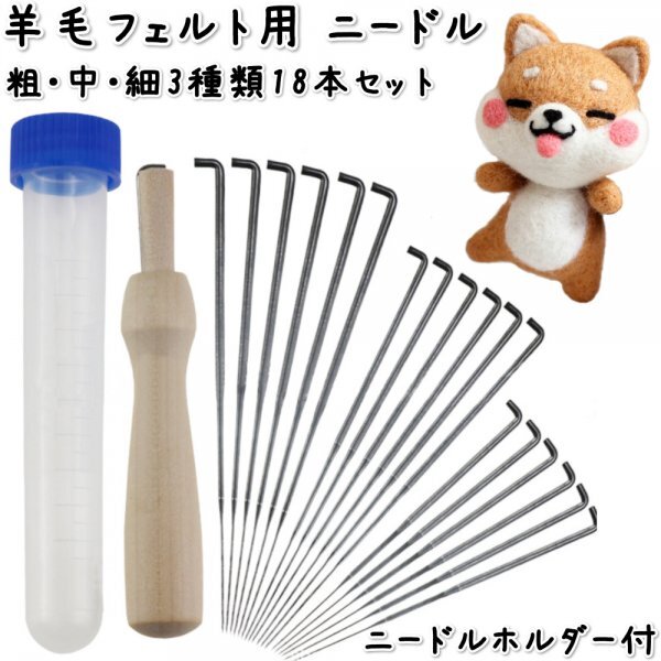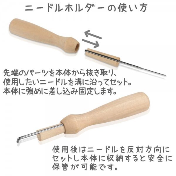 太針、レギュラー針、仕上げ針が各6本、合計18本と針ケース、木製のニードルホルダーのセットになります。