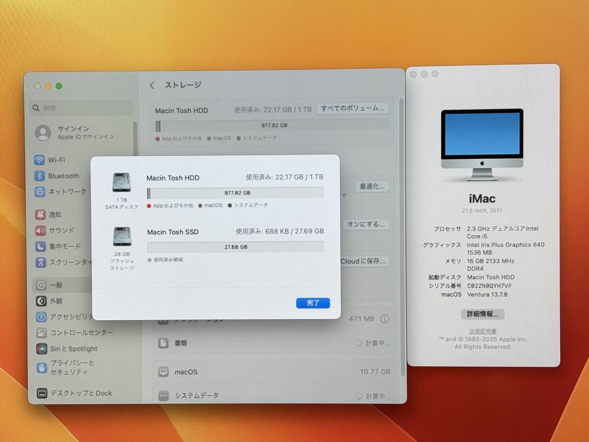 【良品 21.5インチ】Apple iMac(21.5-inch, 2017) A1418『Core i5(7360U)2.3GHz/RAM:16GB/HDD:1TB,SSD:28GB』Ventura 動作品