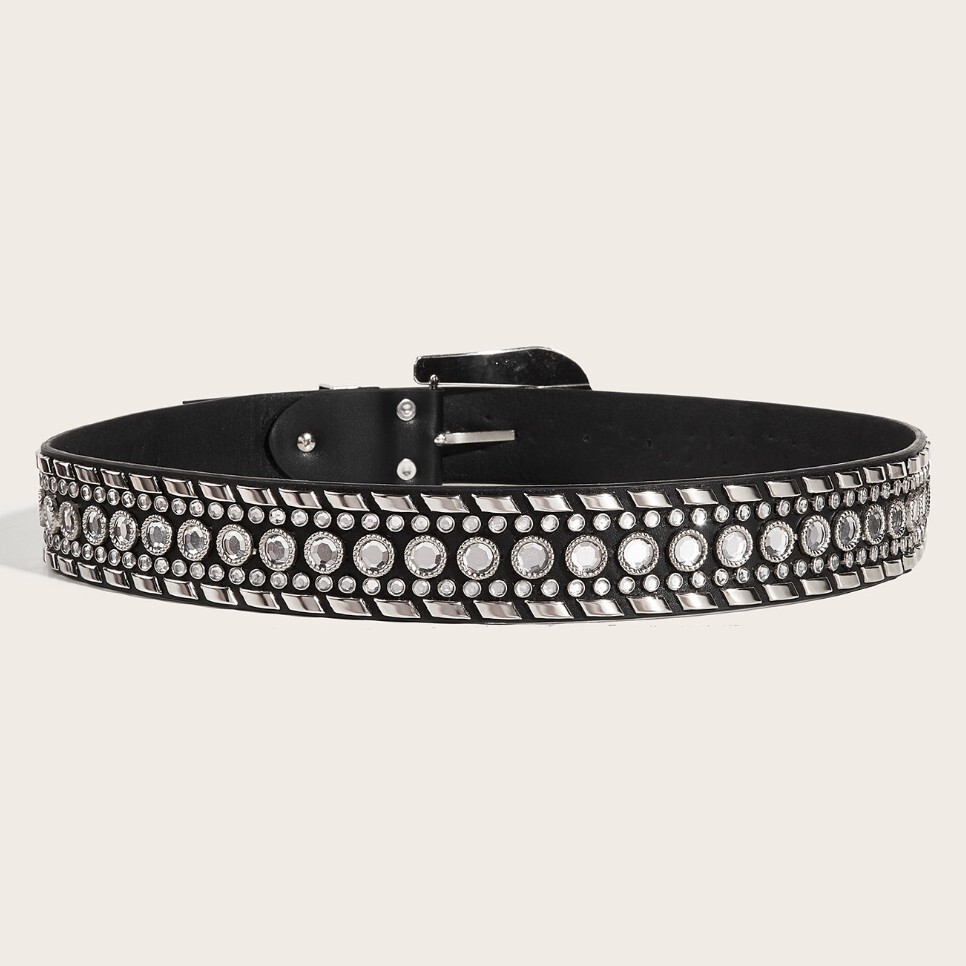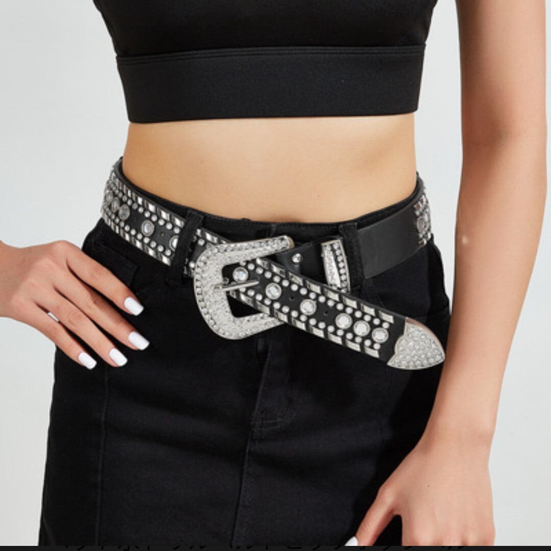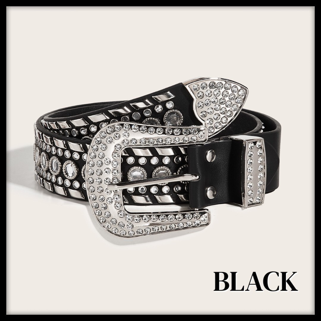 存在感たっぷりの美しいラインストーンが輝く、スタイリッシュなベルトです。シンプルなブラックスタイルに高級感と重厚感をプラスし、日常のコーディネートを格上げします。
