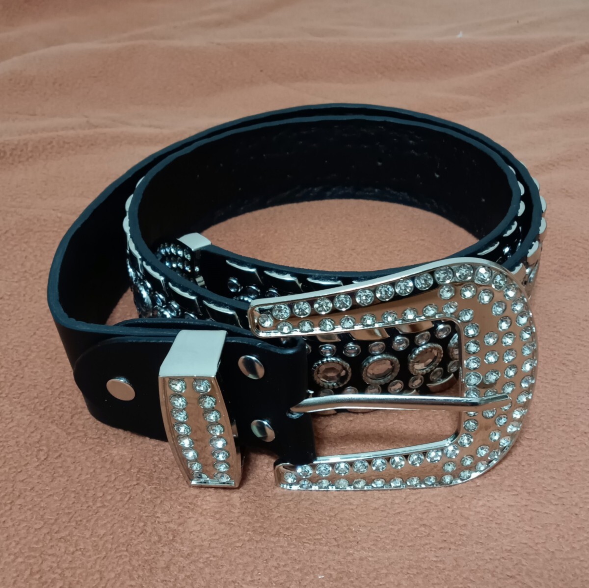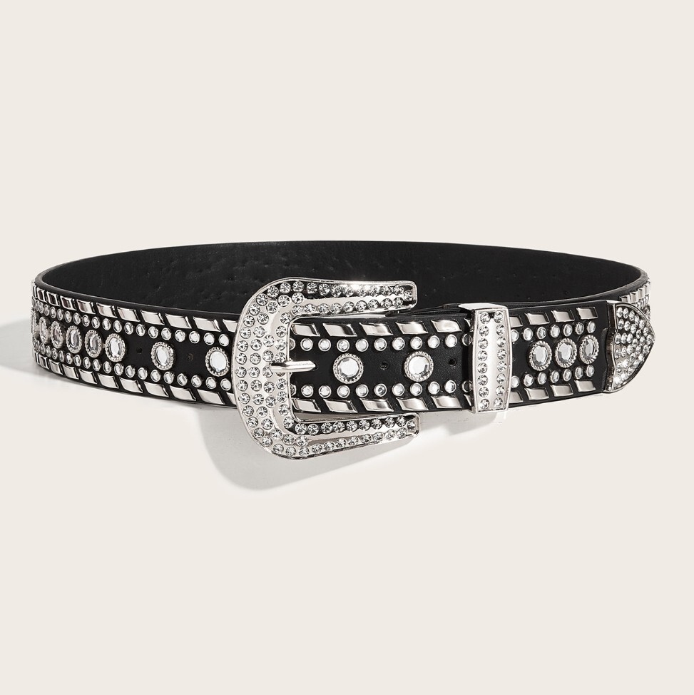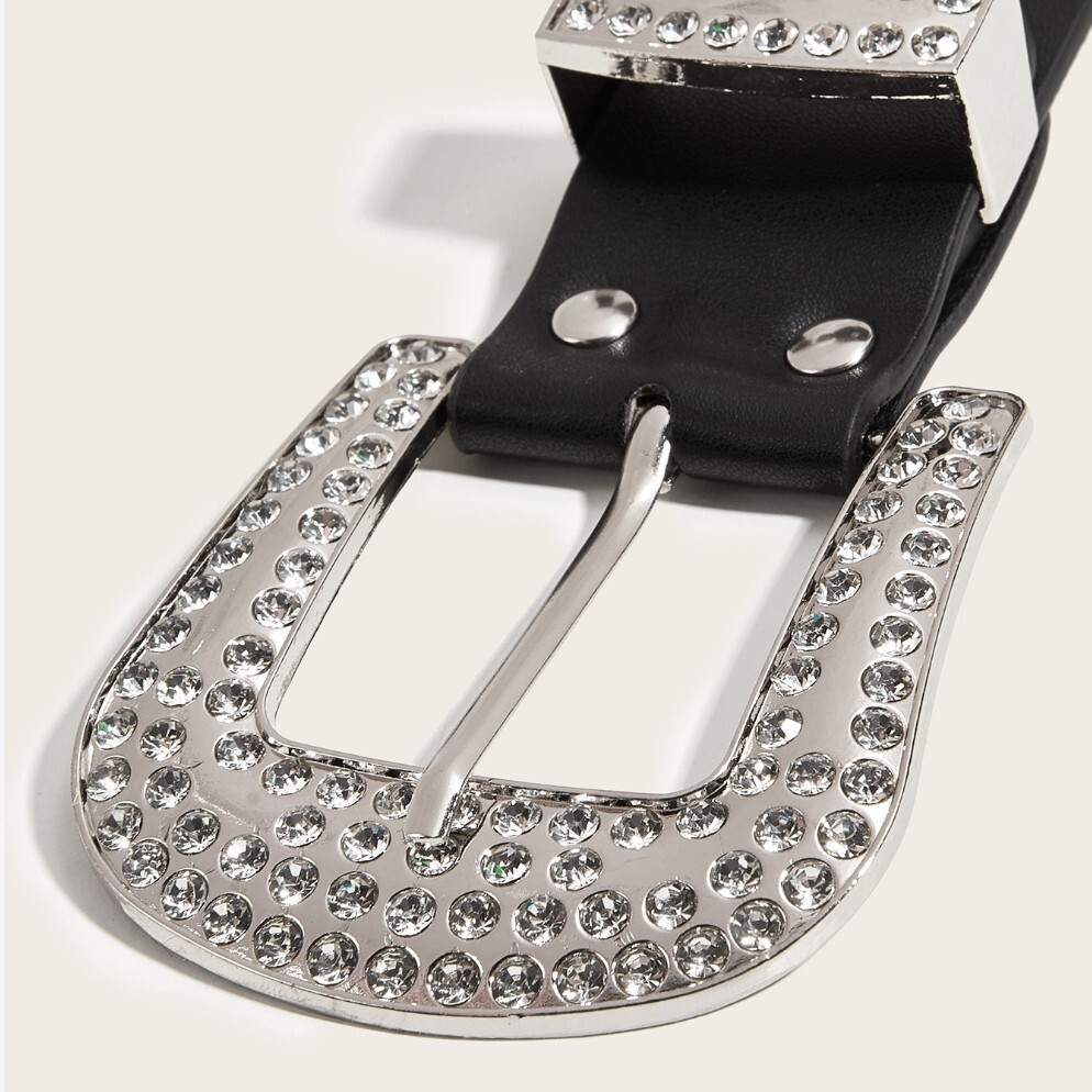 存在感たっぷりの美しいラインストーンが輝く、スタイリッシュなベルトです。シンプルなブラックスタイルに高級感と重厚感をプラスし、日常のコーディネートを格上げします。