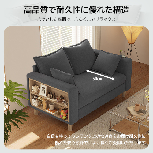 二人掛け 収納ソファー 多機能アームレスト(カップホルダー付) 幅123cm ファブリック 高反発 ソファ 天然木脚 簡単組立 省スペース
