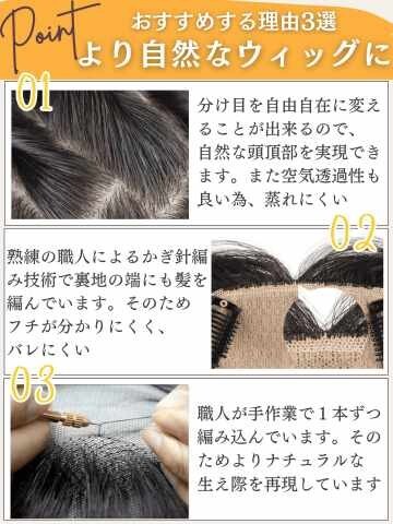 【熟練の職人による総手植え】G特徴:【前髪未カット ナチュラルウィッグ】はつむじや頭頂部周りの薄毛や生え際の白髪にお悩みの、ウィッグ、付け毛、カツラ初心者に最適の商品。植毛方法にもこだわり、二重構造&引き抜き式を採用。高級人毛100%の為、ヘアアイロン、ヘアカット、シャンプーも使用可