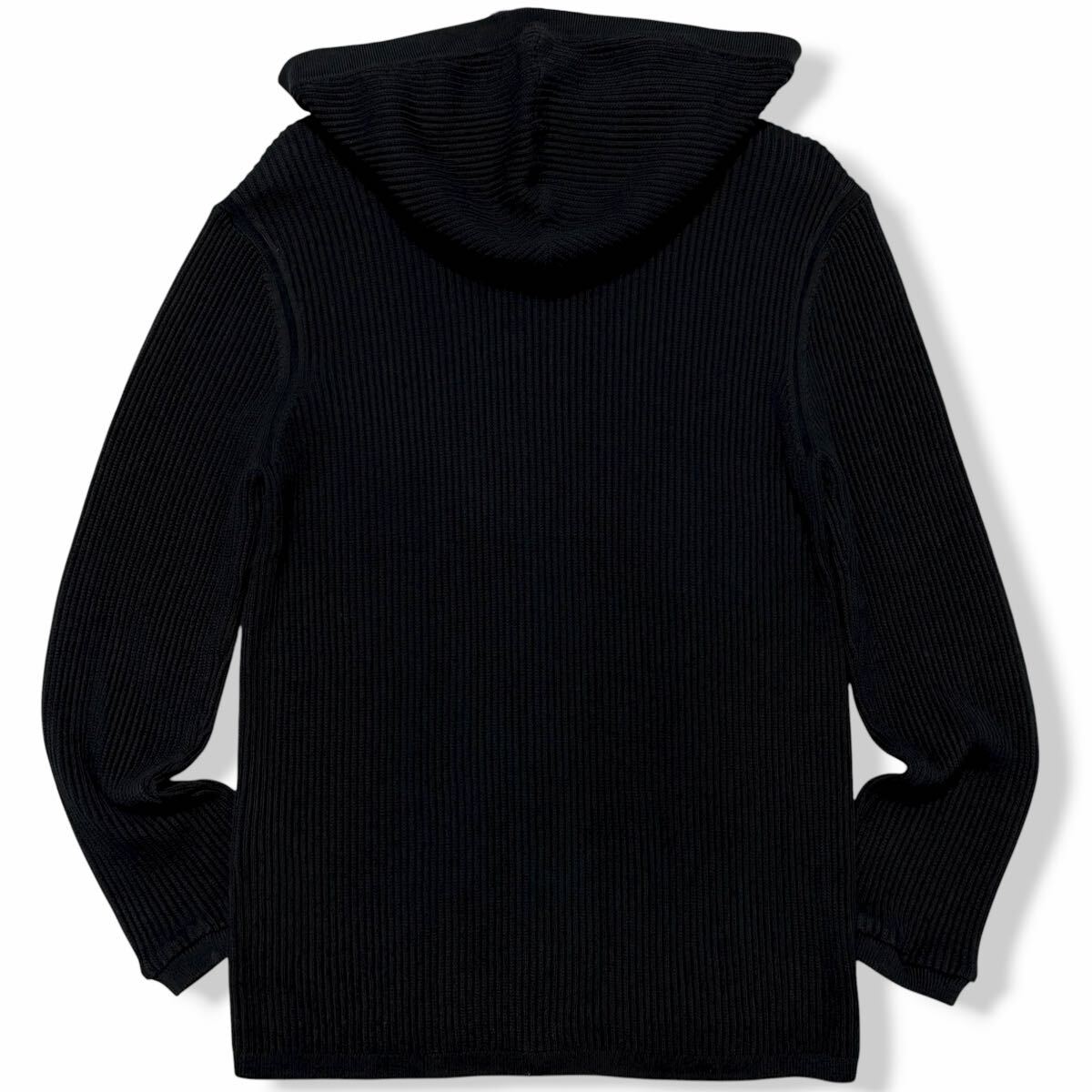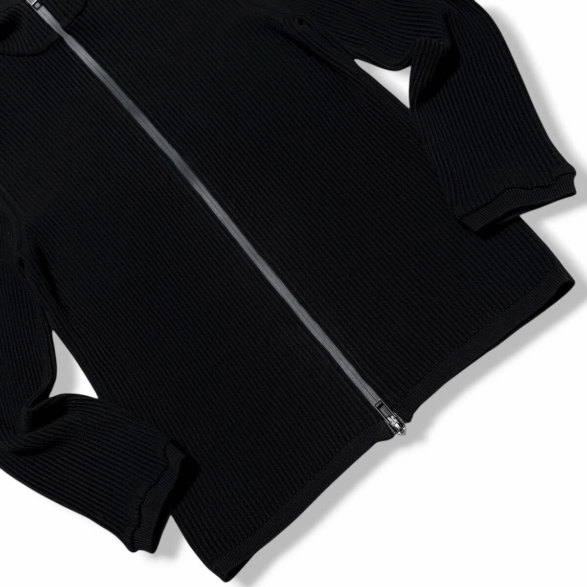 こちらはリブニット素材を用いたニットパーカー。縦に走る立体的なリブ編みが生み出す凹凸感により、ブラック一色でありながら奥行きのある表情を演出しています。程よく身体に沿うシルエットとストレッチ性のあるコットン素材により、着心地は非常に快適で、リラックス感と上品さを高い次元で両立しています。