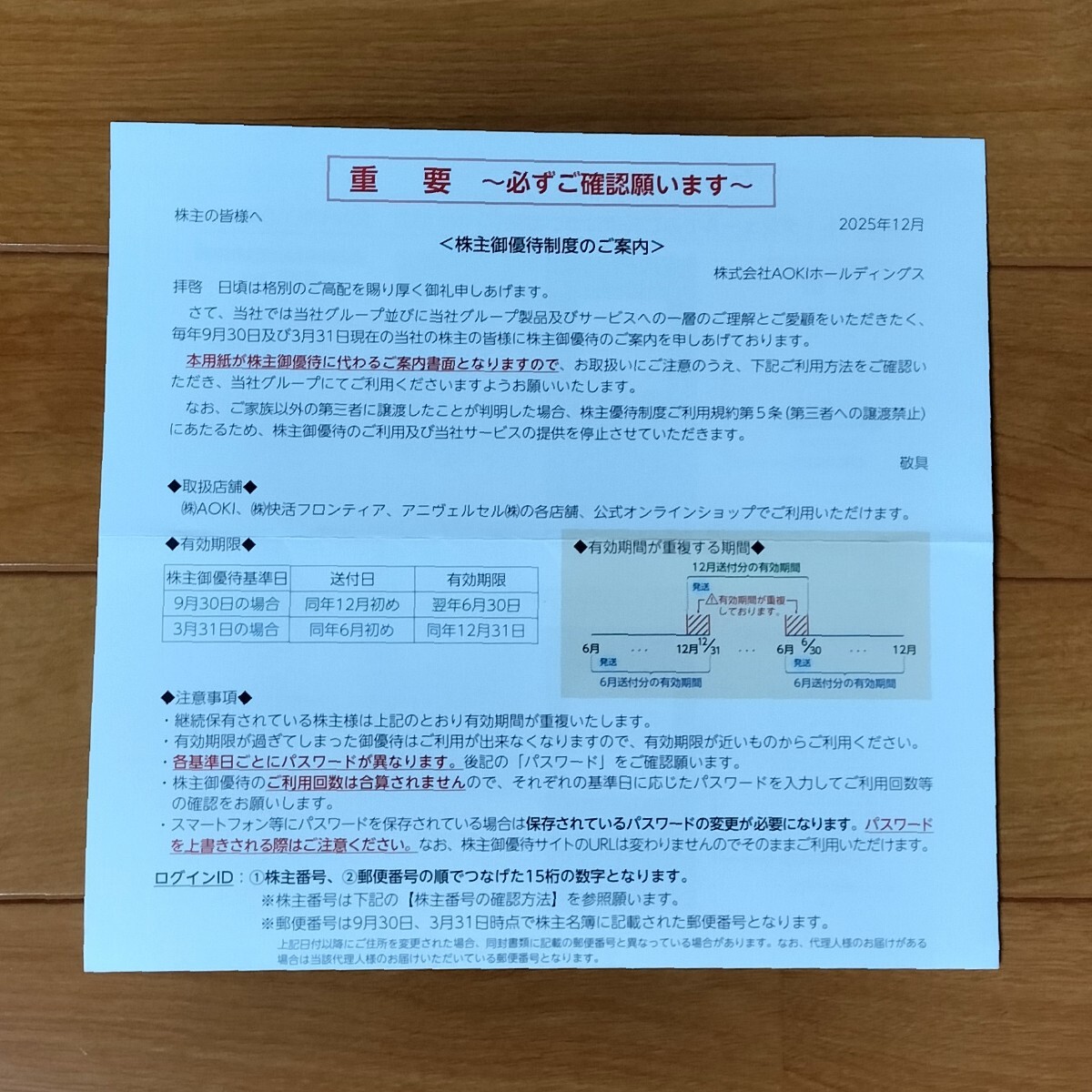 優待サイトURLとログインID、ログインパスワードを取引メッセージでお伝えいたしますので、発送はありません。