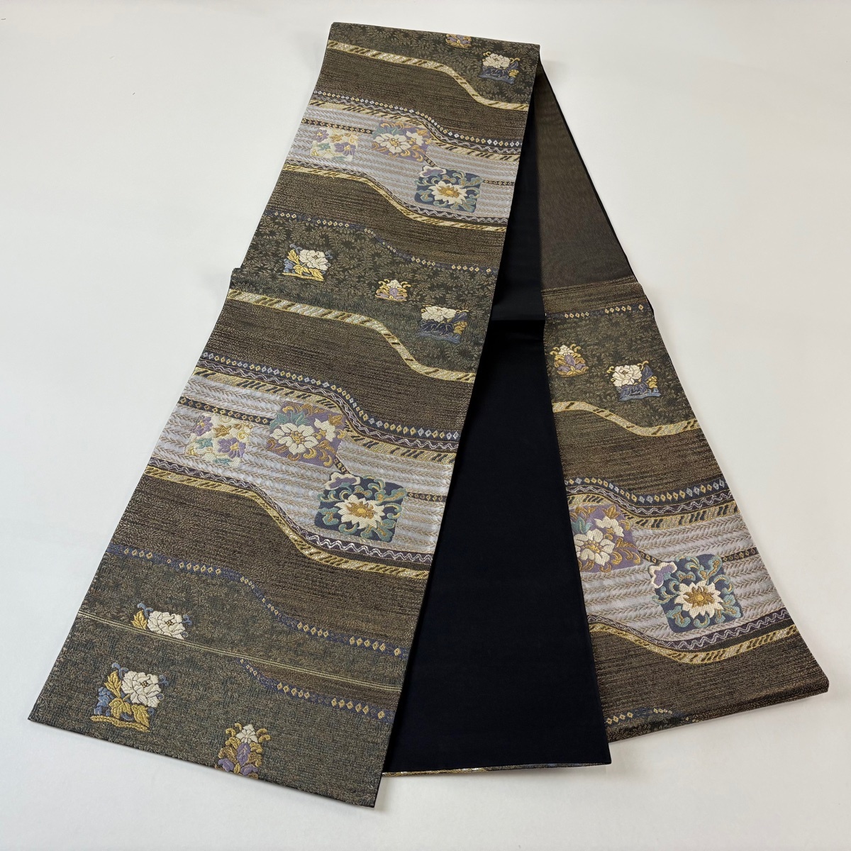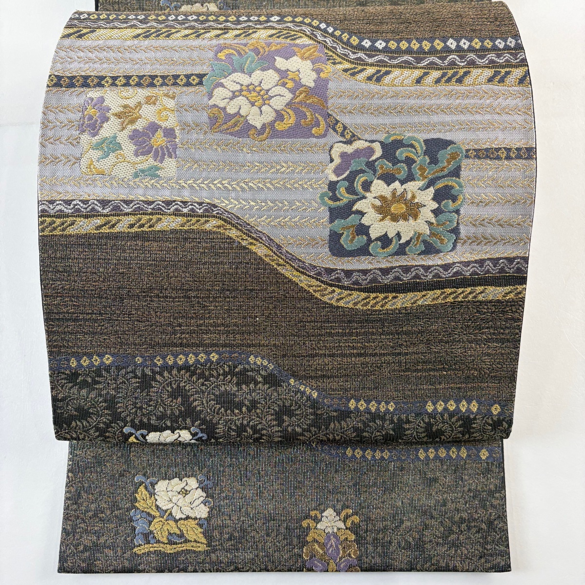 | 袋帯 美品 名品 草花 唐草 金糸 箔 茶色 六通 正絹 【中古】 |