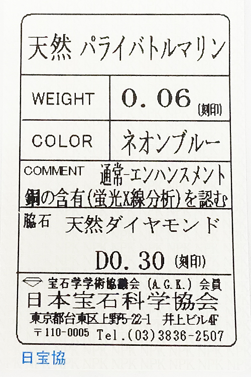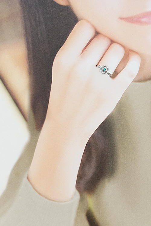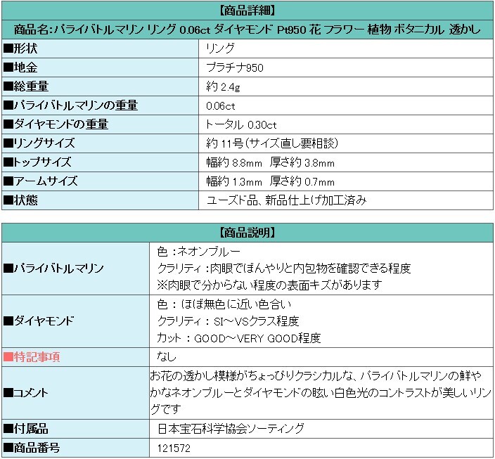 | ■コメント | お花の透かし模様がちょっぴりクラシカルな、パライバトルマリンの鮮やかなネオンブルーとダイヤモンドの眩い白色光のコントラストが美しいリングです |