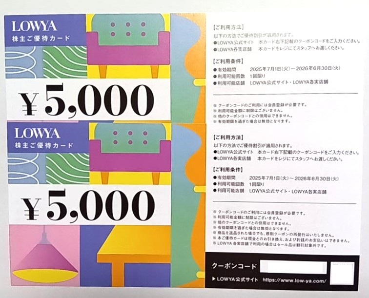 【コード通知】 ベガコーポレーション 株主優待 LOWYA 割引クーポン 10000円分(5000円券×2枚)