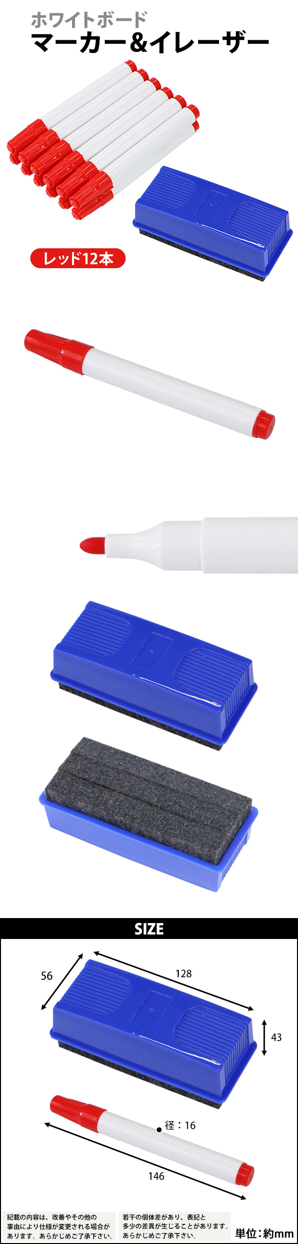 | 商品サイズ | 【本体寸法】 マーカー:約W146×約D16×約H16(mm)(1本あたり) イレーザー:約W128×約D56×約H43(mm) 【梱包寸法/重量】 約W150×約D180×約H60(mm)/265g |