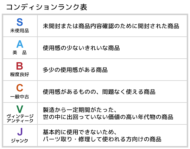 | ※付属品やメーカー保証書の有無は商品説明をご参照ください。 ※コンディションランクを理由としたご返品 はお受けしておりませんので、目安としてお考えください。 |