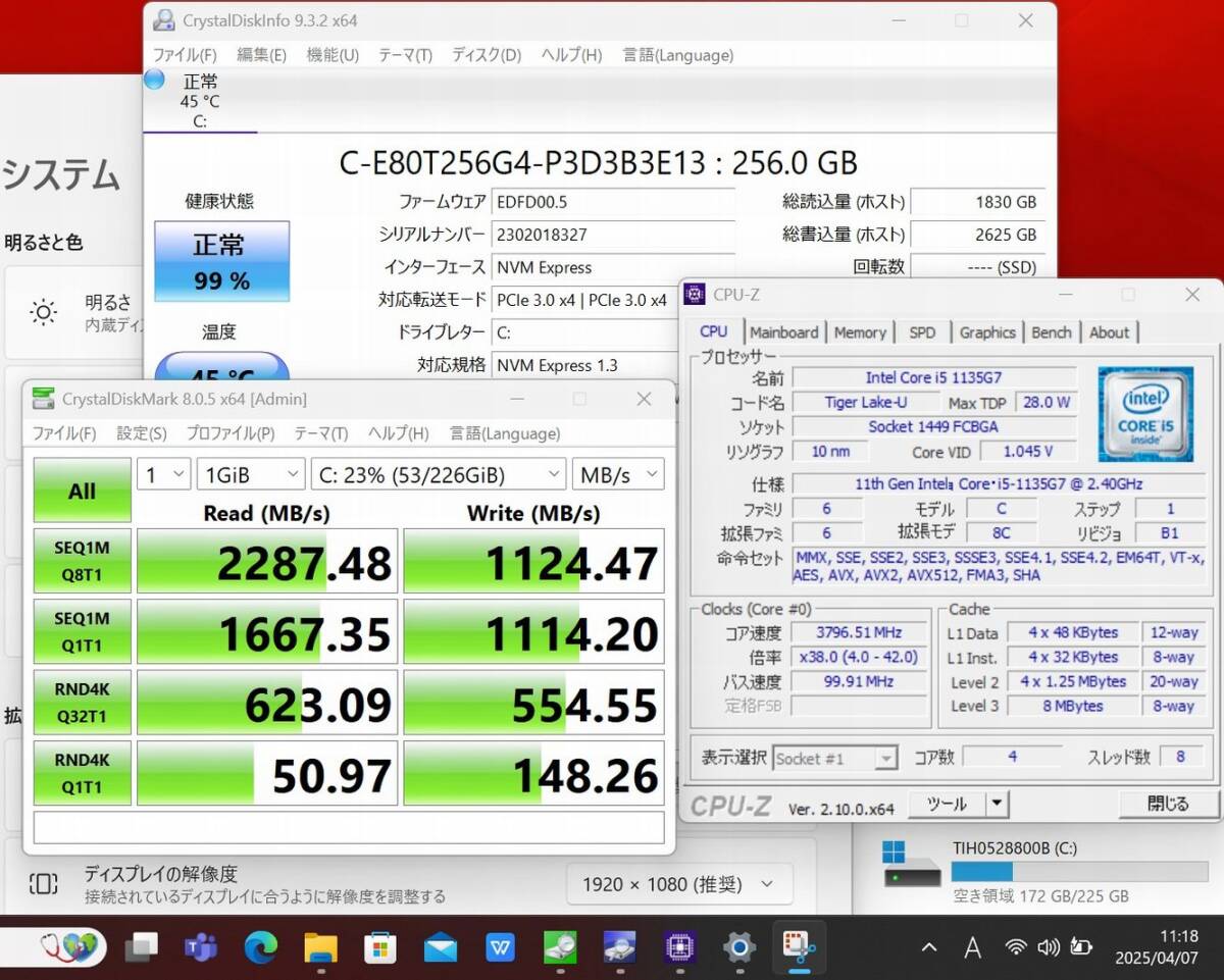 | CPU: 超高速 Intel 卓越性能 第11世代Core i5-1135G7 2.4Ghz、 4コア8スレッド (ターボ・ブースト利用時の最大周波数 4.2GHz) |