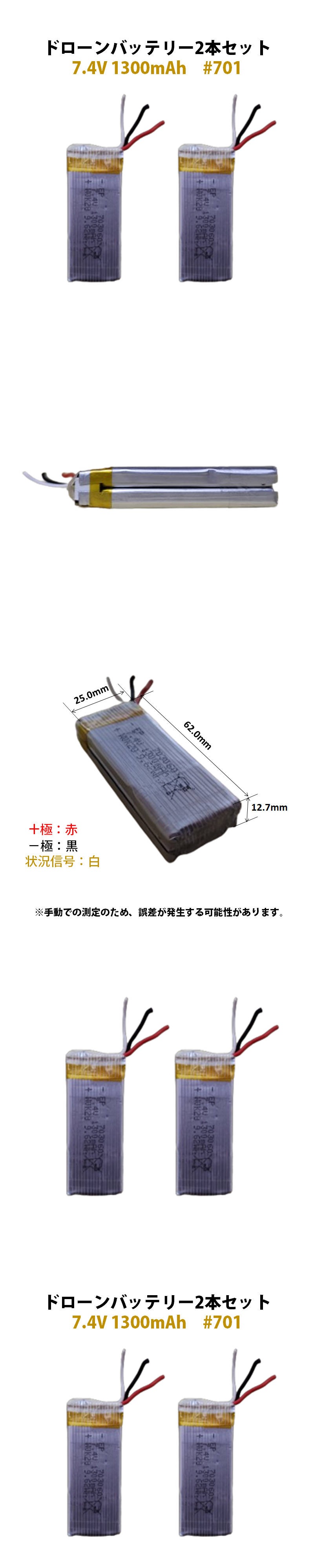 | ドローンの汎用バッテリー2本セットです。電圧:7.4V,容量:1300mAh |