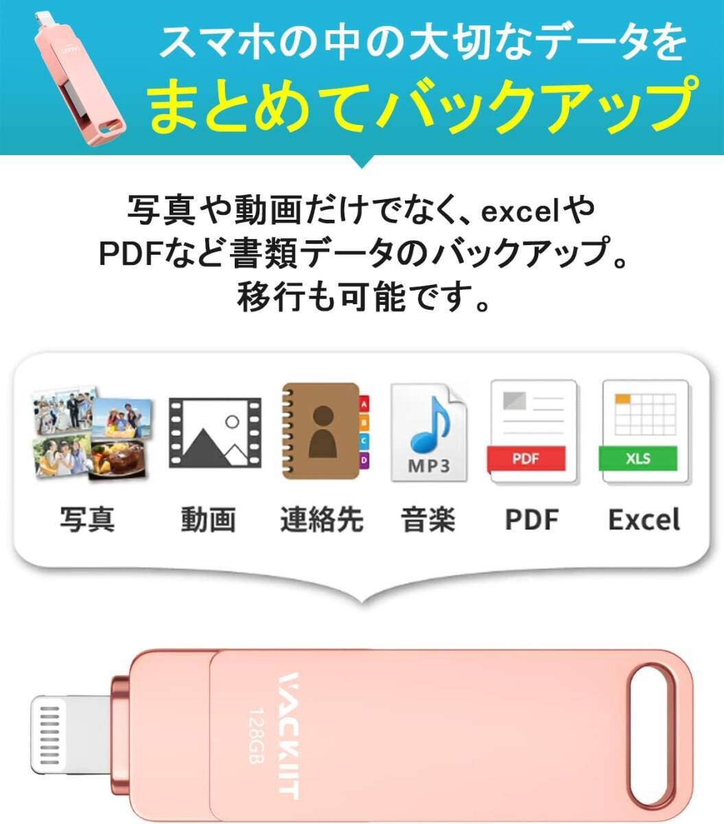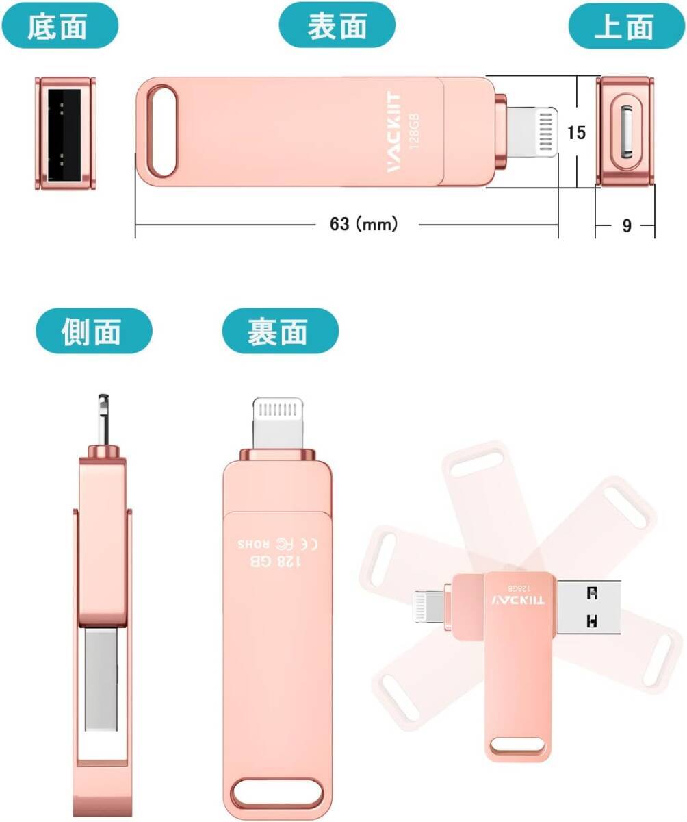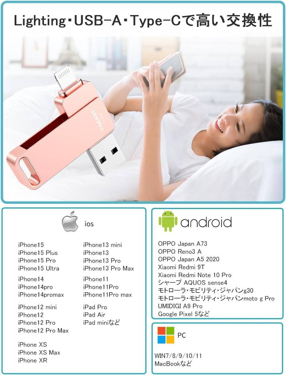 この商品について「安心して使えるMFI認証iPhone usbメモリ」当社のusbメモリはApple社のMFi認証取得を取得、認証番号。Made for iphone/ipad認証Lightning USBメモリは安定したデータ通信が可能で 、IOSを最新版にアップデートしても、引き続き使用出来ます。「3 IN 1 人気のランキングusb メモリiphone」当社のUSBメモリ・フラッシュドライブはlightning・usb-A ・type-c 3つの端子がつきので、iphone iPad iPod/Win Macではなく、Androidでも使用可能で、デバイスの間、データ転送が楽々!更に、当社のUSBメモリはUSB3.0対応でUSB2.0より性能アップさせ、高速なデータ転送を実現、大容量のデータや写真・ビデオも短時間で転送可能です。「スマホ容量対策のUSBメモリ・フラッシュドライブ」本スマホ USBメモは超軽量でコンパクトなスタイリッシュボディ、そしてキャップレスの360°回転式デザインで、どこにでも持ち運べます。スマホで撮った写真をフラッシュドライブに保存したい時、会議資料を素早く共有したい時、wifiとパソコンがない場合など便利で、旅行・通勤・会議に最適なiphone usbです。「大容量usbメモリ・幅広い交換性アイフォンusbメモリ 」128GB のiPhone USBメモリでストレージを拡張でき、iOS デバイスを容量不足から徹底的解放させます!更に、すべてのiPhoneおよびiPadシリーズと互換性があります。iPhone14/14 pro /14 Pro MaxiPhone 13 /13 Pro/13 Pro Max/13 mini/iPhone 12 /12 Pro/12 Pro Max/12 mini/ 11 /11 Pro/11 Pro Max / SE (第2/1世代) /X /XS/XS Max /XR/8 Plus/8 / 7 Plus/7 /6s Plus/6s/6 6 Plus /Pad Pro / iPod touch 6/ MacBook Air/Macbook Pro/ iMac/PC /ノートパソコンなどのデバイスに対応します。